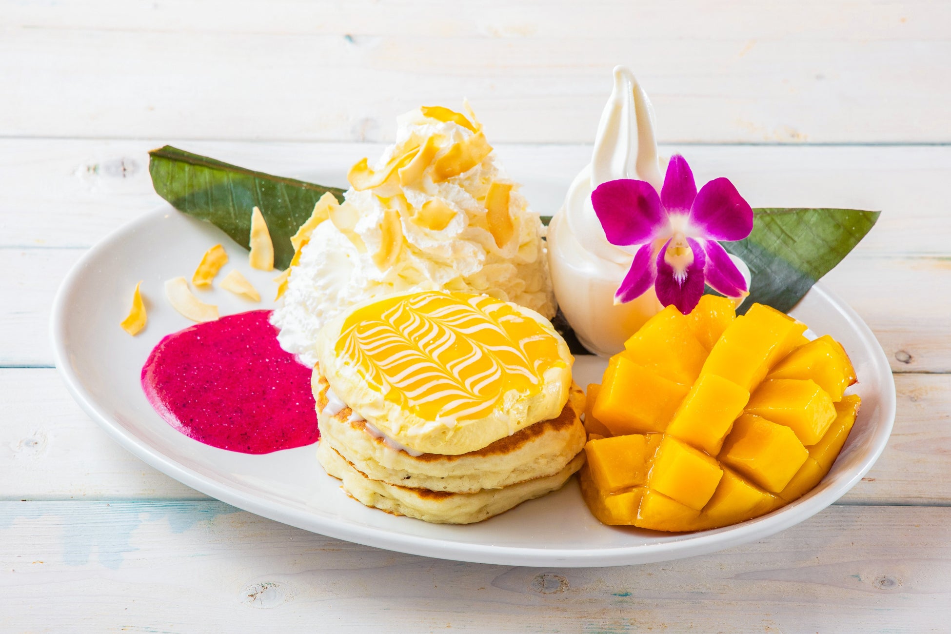 ふわふわのホイップクリームにはサクッと香ばしいココナッツチップスをトッピング。ひんやりとしたソフトクリームはマンゴーとの相性もぴったり。ハワイを感じられるトロピカルな新作パンケーキをご賞味ください。