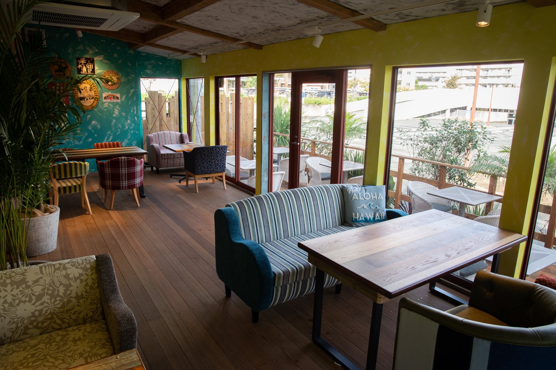 カラフルなハワイアン雑貨やサーフボードが飾られ、遊び心のあるソファやテーブルなどのこだわりのインテリアが、まるで、ハワイのローカルのリビングにいるような雰囲気を演出します。ゆったりとくつろげる空間で、日本にいながらハワイ気分を味わえます。