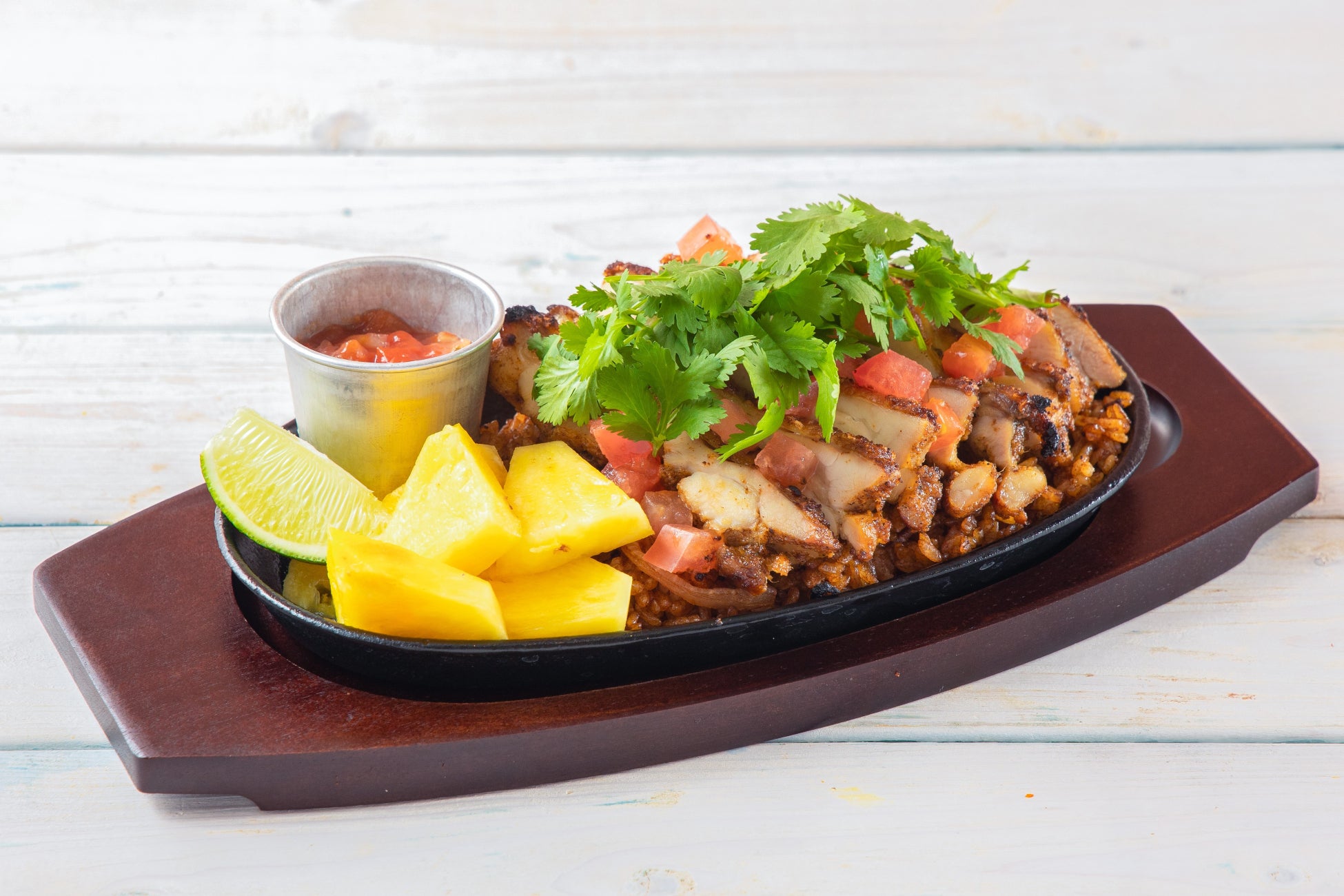 刺激的な辛さが特徴の「ジャンバラヤ」に、香ばしくグリルしたチキンと焼きパイナップルを添えてコナズ珈琲風にアレンジ。チリパウダーやクミン、オレガノを使用したスパイシーな味わいが特徴の“ケイジャン”でマリネしたチキンを香ばしく焼き上げ、ケイジャンライスにトッピング。チリトマトをかけるとさっぱりとした味わいに、焼きパイナップルと食べ合わせるとパイナップルの酸味と甘みをより感じられ、味の変化をお楽しみいただけます。
