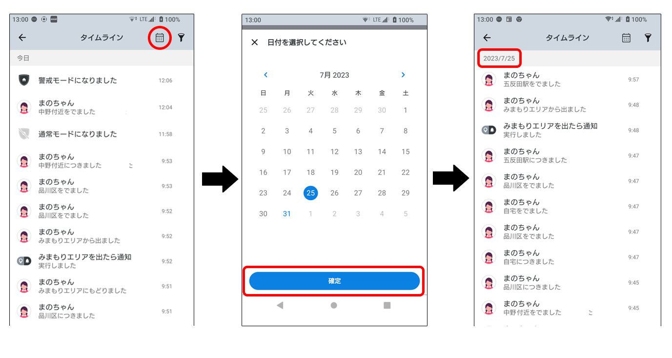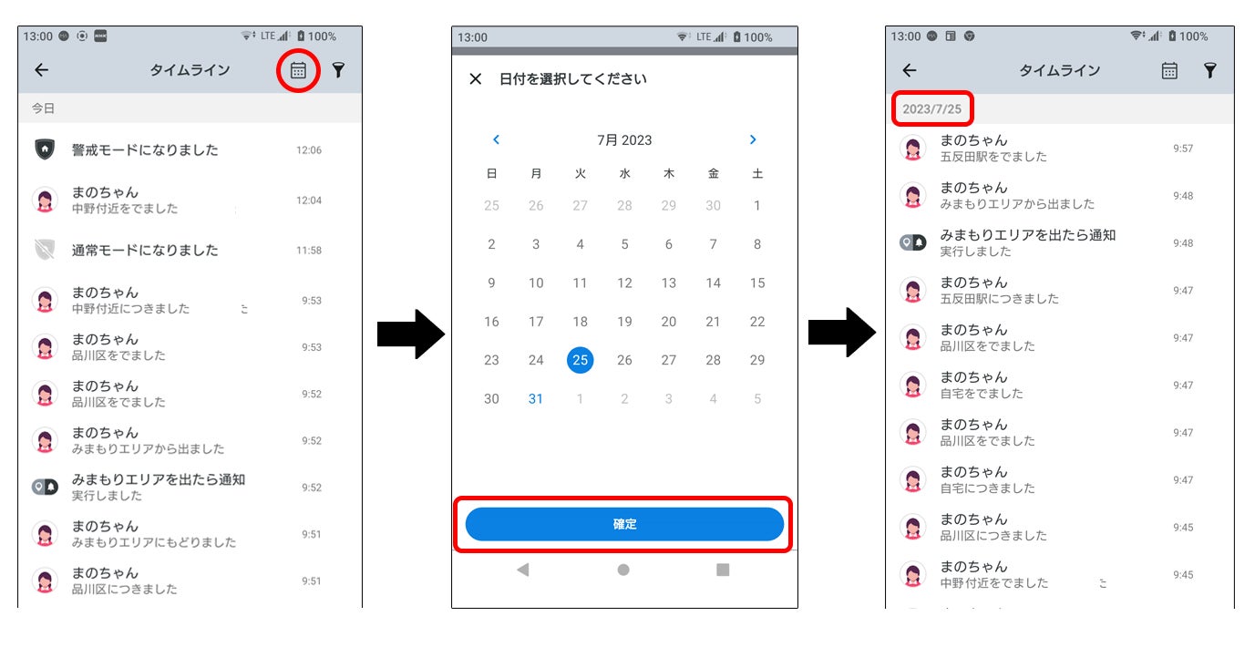「自分が見たい日時の履歴を検索する場合は、タイムライン表示画面の上下スクロールでのみの検索となり、到達しづらい」というお客さまの声をもとに、指定した日付にすぐに遷移できるようになりました。
