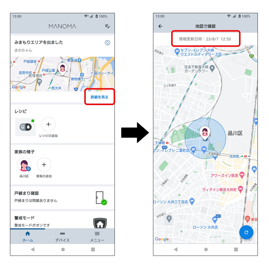「みまもりエリアを出た通知に気づいても、過去いた場所しかわからず、不安になる」というお客さまの声をもとに、現在いる場所の地図を表示するように改善しました。場所の更新時間は、「地図で確認」画面でご確認いただけます。