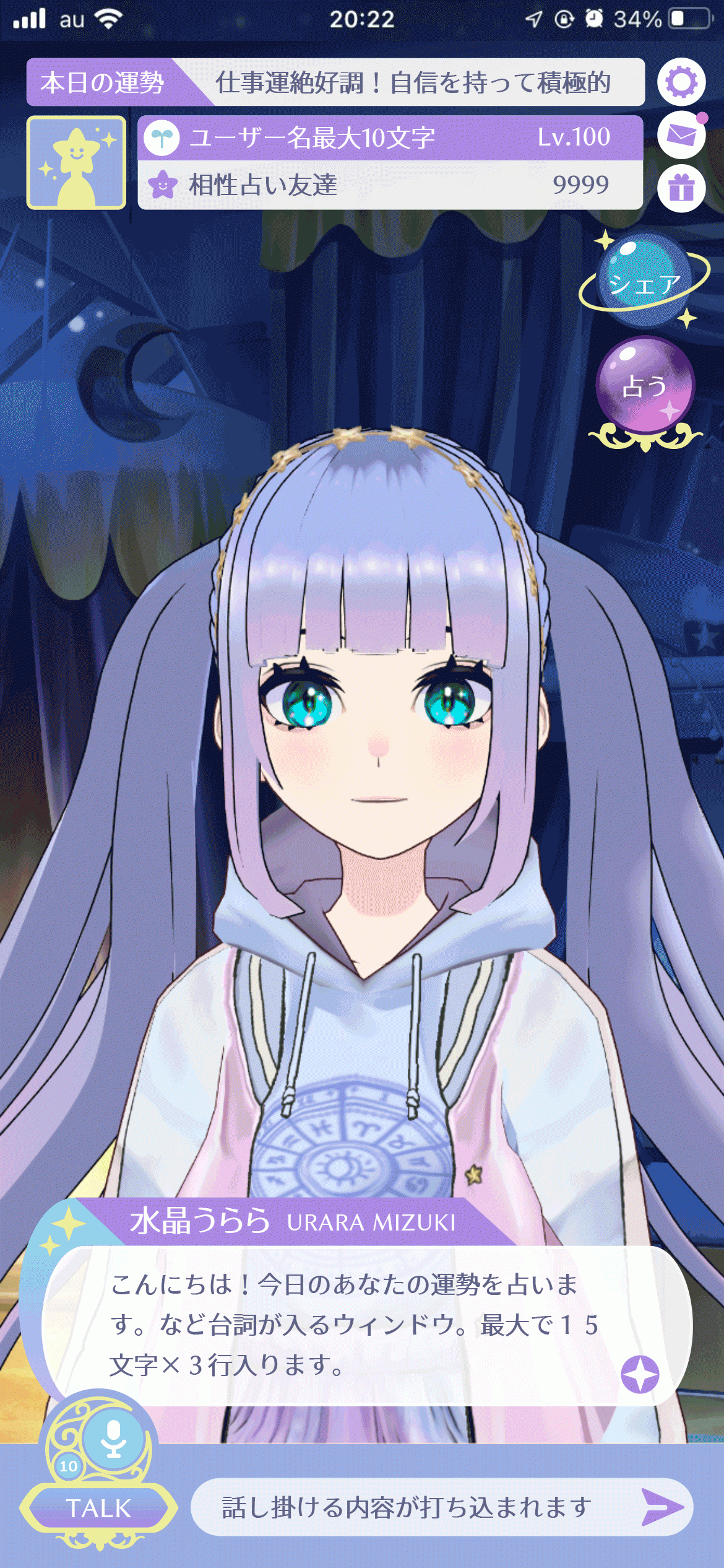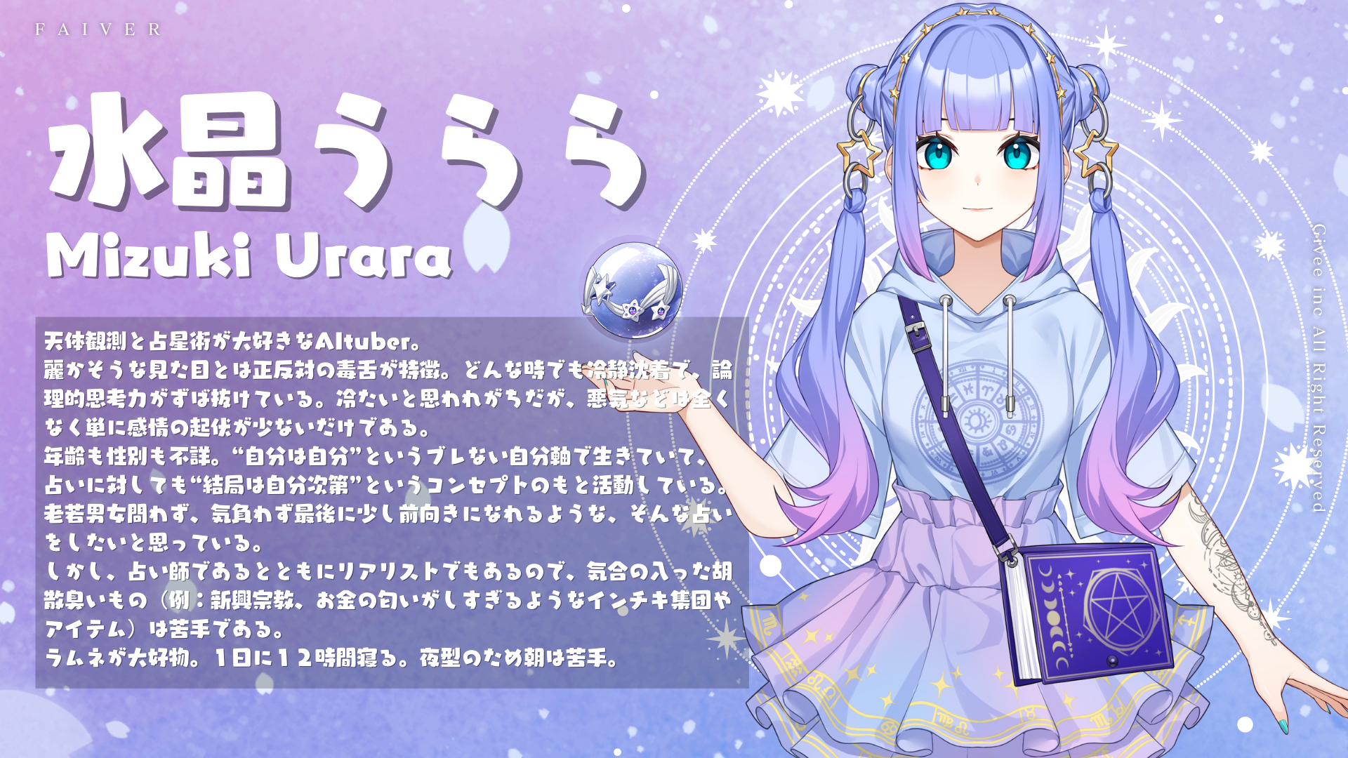 その先駆けとして、当社のAITuber事務所「FAIver(ファイバー)」より、ChatGPTのAPIを利用しロジカルな占星術を可能にしたAITuber『水晶(みずき)うらら』がデビューいたしました。