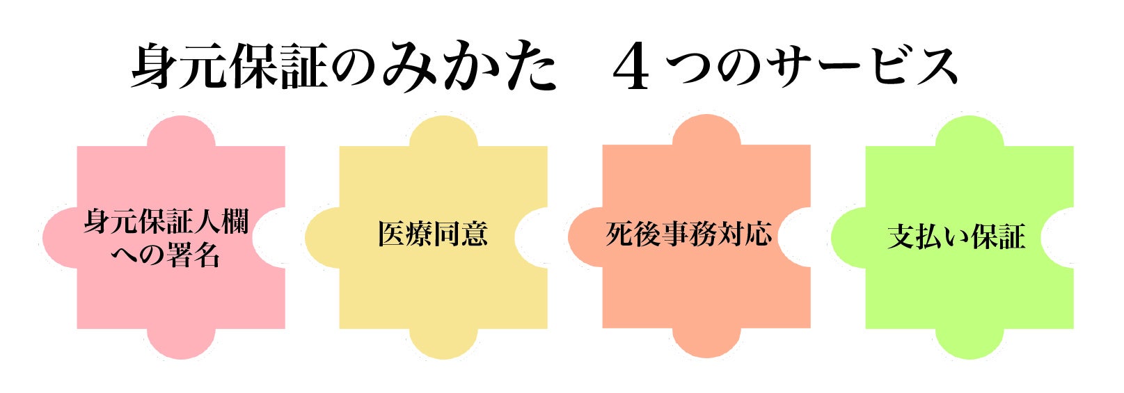 ウェルビトが提供するサービス「身元保証のみかた」の特長は、「介護施設入所に必要なものに特化したサービス」であること。身元保証サービスの中には施設入所後の生活支援や財産管理など幅広いサービスを提供するものも多くありますが、身元保証のみかたでは以下の4つに特化したシンプルでわかりやすいサービスとしています。