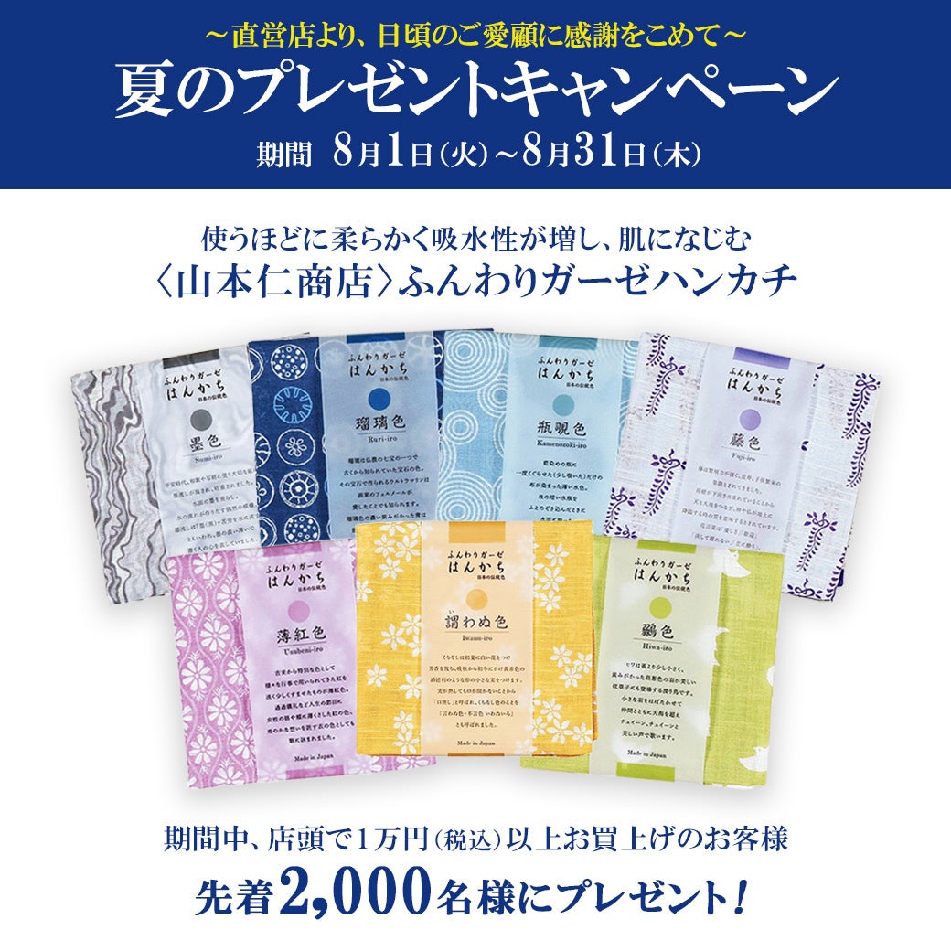 総合カタログ通販ライトアップショッピングクラブの直営店、LightUp/Zekoo 銀座店・名古屋店・大阪店・福岡店にて、日頃のご愛顧に感謝を込めて、夏のプレゼントキャンペーンを開催。期間中、各店舗にて1万円(税込)以上お買上げのお客様、先着2,000名様に〈山本仁商店〉ふんわりガーゼハンカチをプレゼントします。皆様のご来店をお待ちしております。