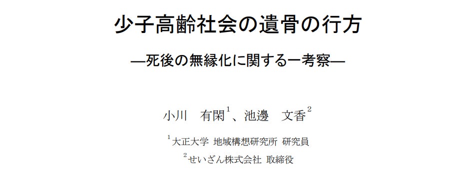 「敬う心をひろげ、次世代につなぐ」を企業理念に掲げ、日本の寺院支援を介して地域社会への貢献を目指す、せいざん株式会社(登記住所:〒108-0073 東京都港区三田1丁目4−28 三田国際ビル 23階 代表取締役:岩田貴智 以下「せいざん株式会社」)の取締役池邊文香が2024年5月29日に大正大学地域構想研究所の2023年度紀要「地域構想」第6号で研究ノート『少子高齢社会の遺骨の行方-死後の無縁化に関する一考察-』を大正大学 地域構想研究所研究員で僧侶の小川有閑氏と共著で発表したことをお知らせします。