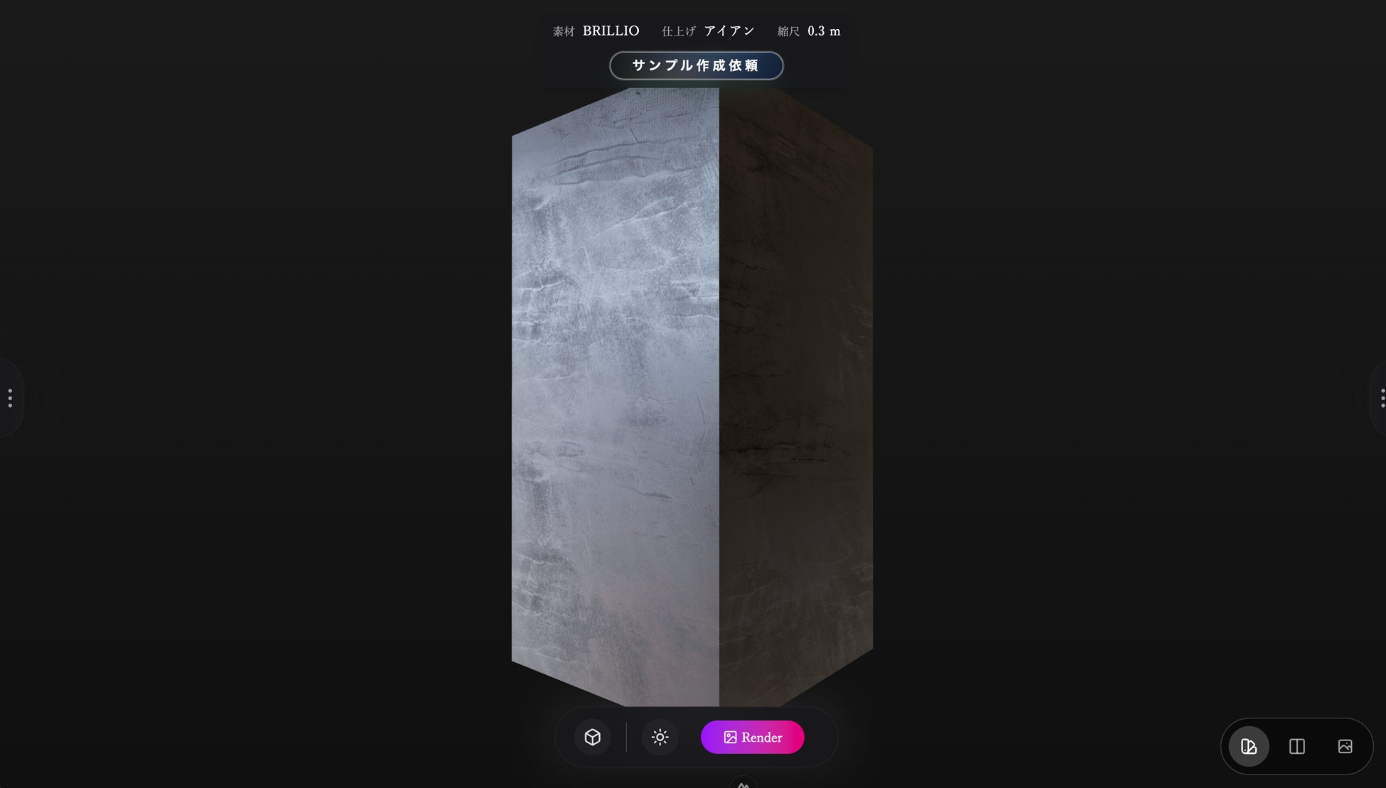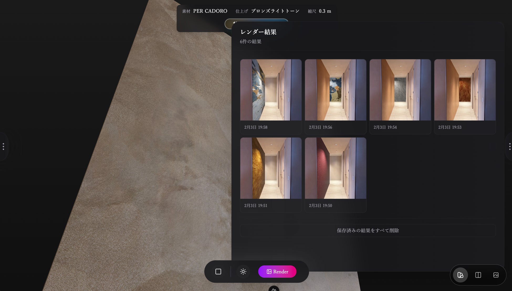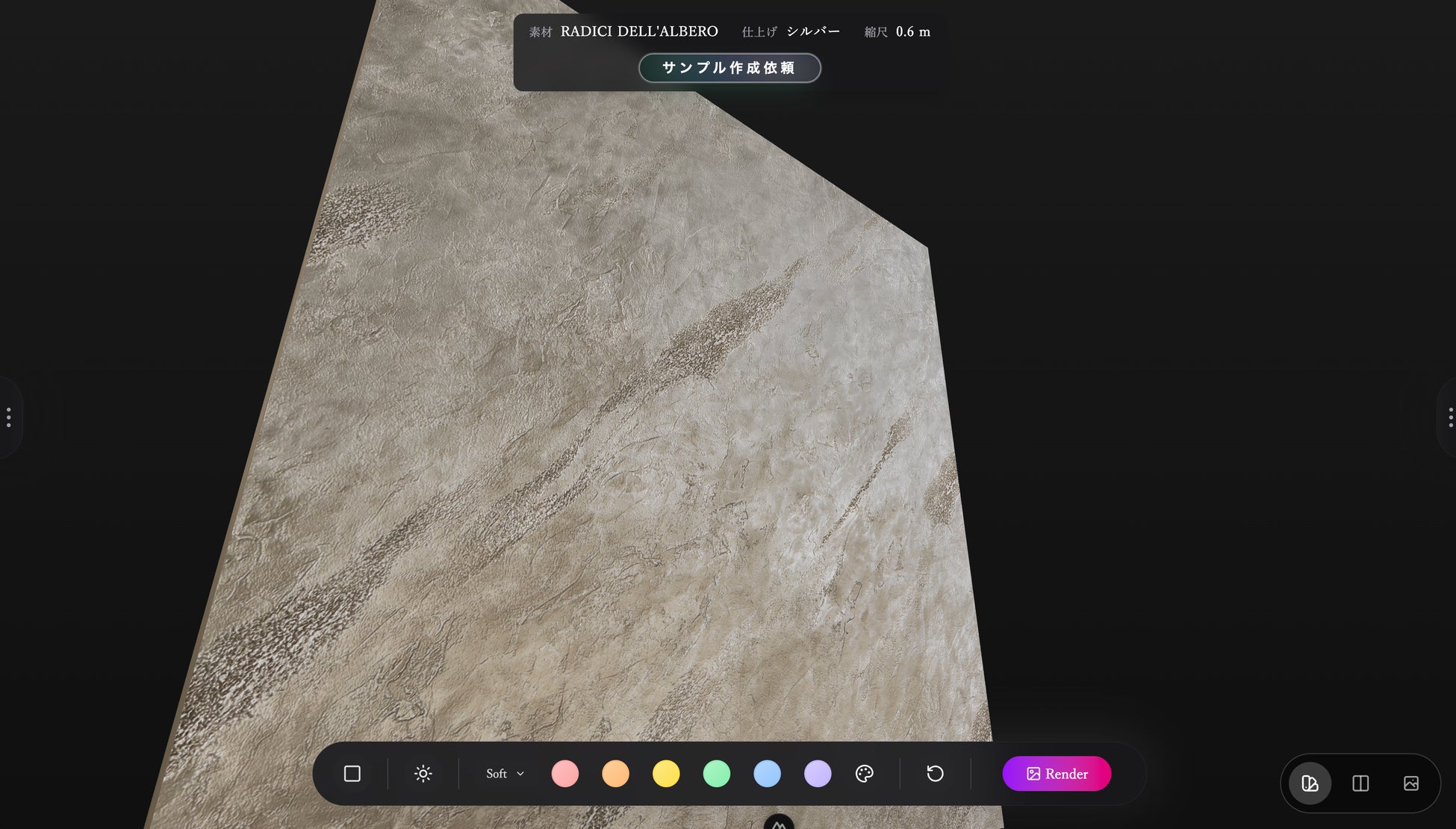 スタッコプラスが扱うイタリア伝統の左官材や特殊塗装の繊細なテクスチャを忠実に再現します。その仕組みは、空間全体を一度3Dとして再構築し、対象となる壁面領域を物理特性を持つマテリアルデータに置き換えます。その上で、写真内の照明の当たり具合を自動解析し、3D空間内に仮想ライトを配置に取り込むことで、素材を適用した後のイメージを生成します。