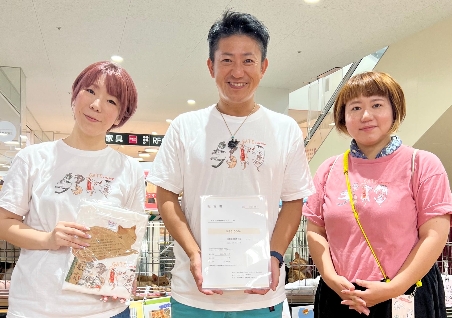 <保護猫譲渡会にて寄付金額報告の様子(左から順に)みさとプロモーション 宮崎、みさと動物愛護クラブ 佐々木様、citta design 浅川様>