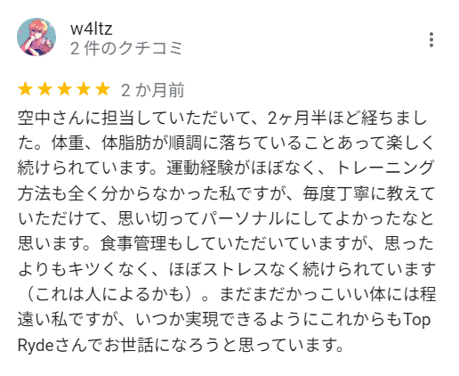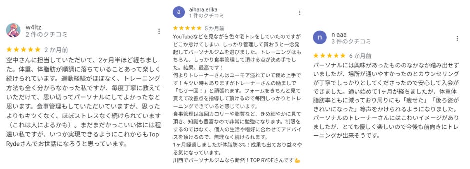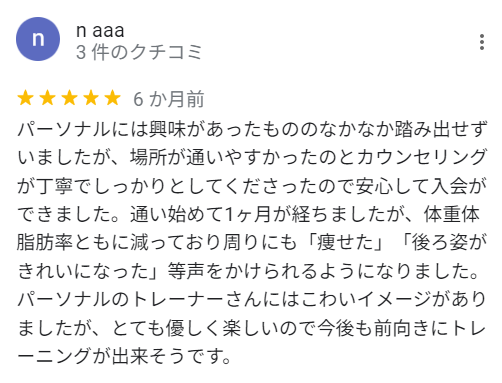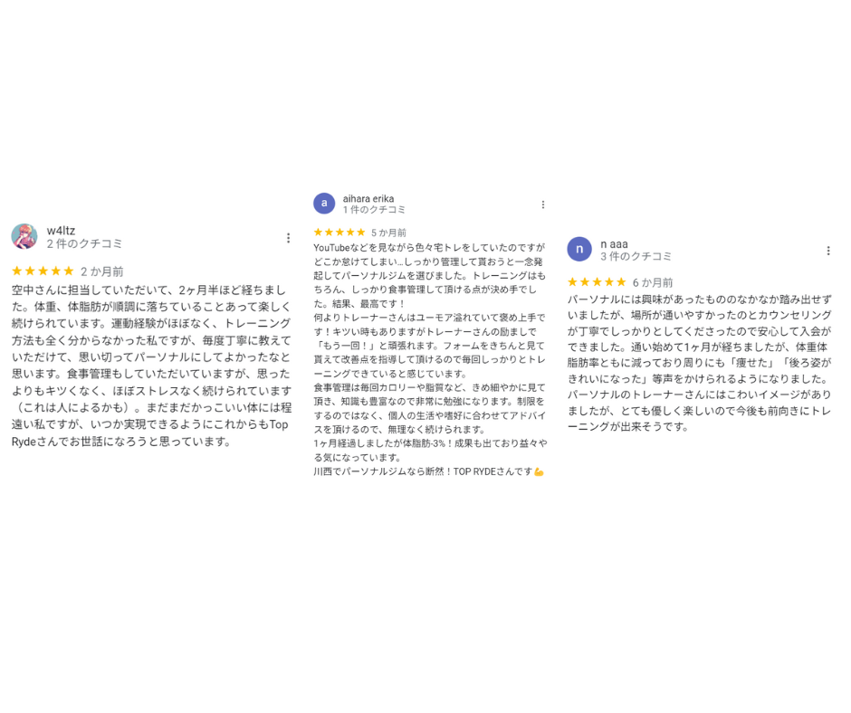2023年現在、川西市・池田市エリアの口コミ評価にてNo.1評価を獲得致し、ダイエット初心者の方々が初めて始めるジムとして絶大な人気を誇っております。