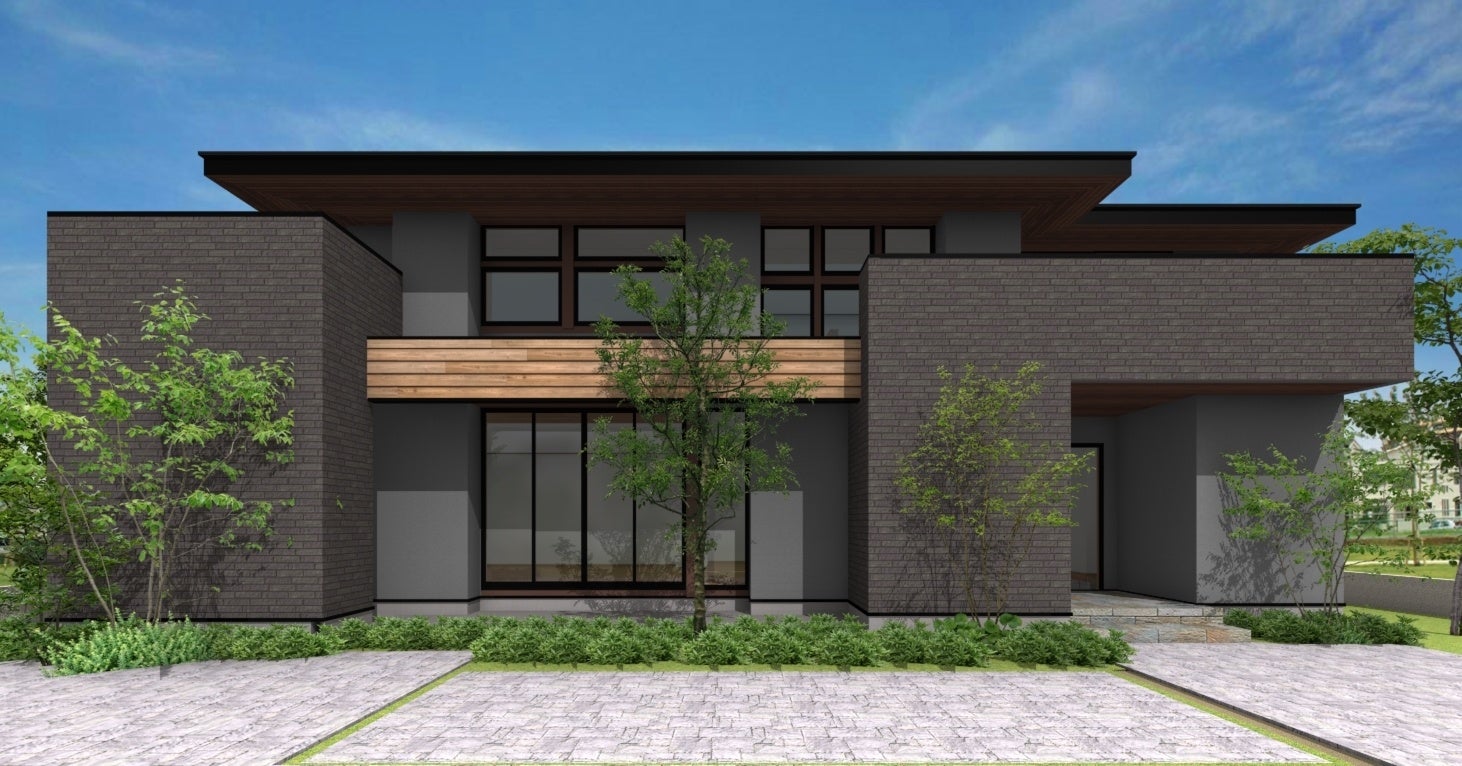 水平に伸びる深い軒や、ダークカラーの外壁が風格を醸し出す外観。軒裏やアクセントに使われた木が優しいぬくもりを添える、落ち着いた佇まいです。