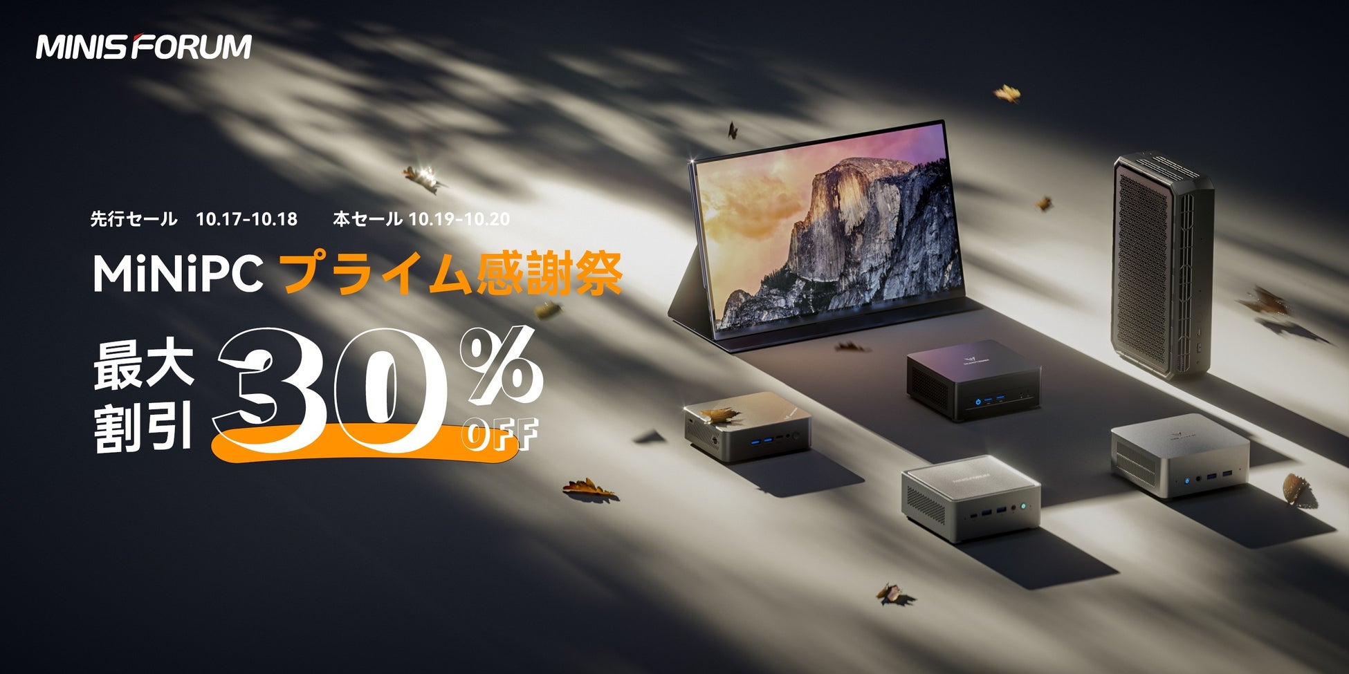 ミニ PC 製品の開発から製造・販売まで一貫体制の企業MinisforumはAmazonで2024年10月19日(土)0:00から10月20日(日)23:59に開催される「プライム感謝祭」に参加決定!人気製品最大30%OFFのセール価格でご購入いただけます。
