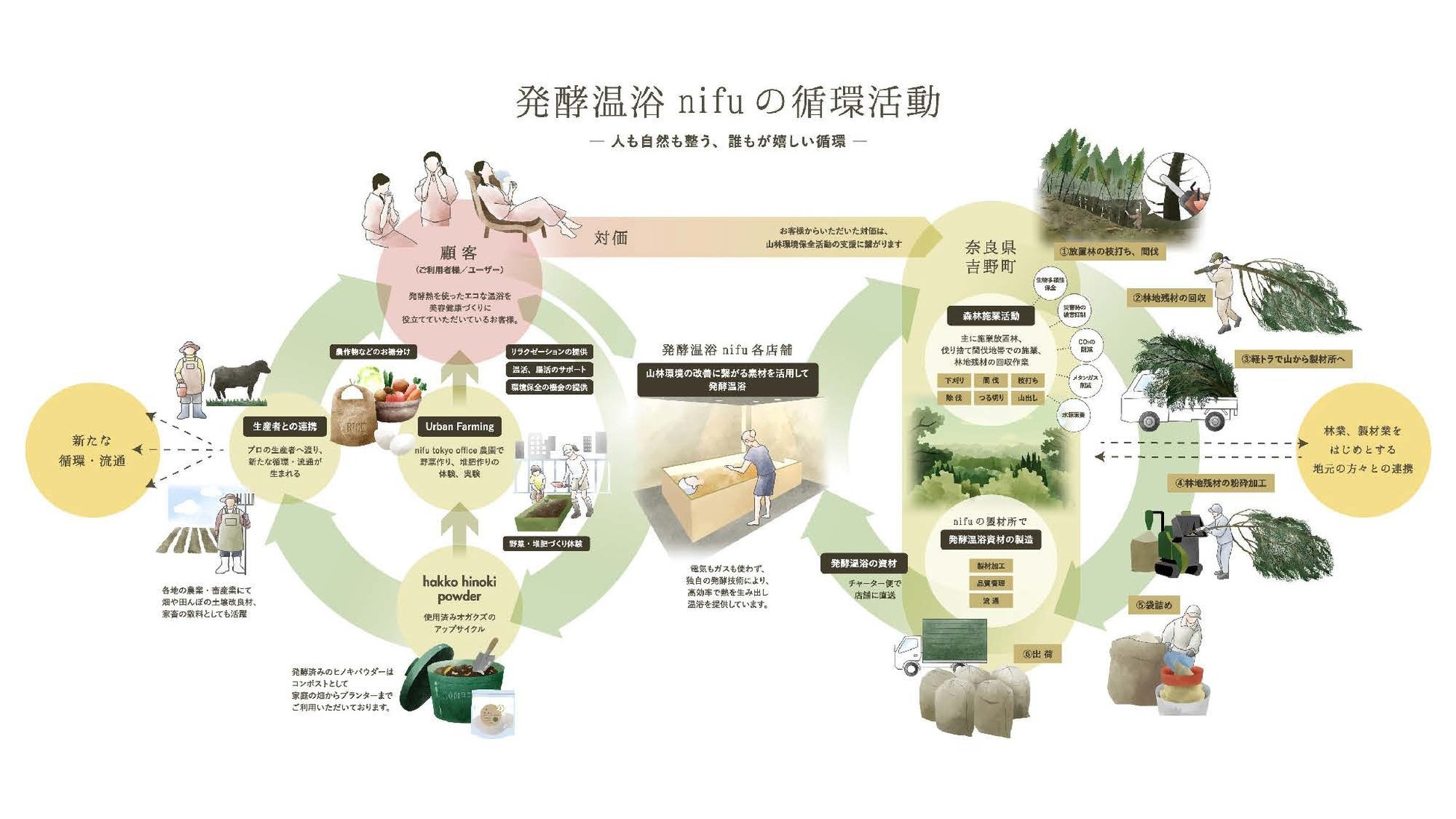 放置林の間伐を始めとする森林施業を自ら行い、林地残材などの未利用資源を美容目的素材にアップサイクルする「発酵温浴nifu」がソーシャルプロダクツ・アワード 2024にて環境大臣特別賞を受賞しました。