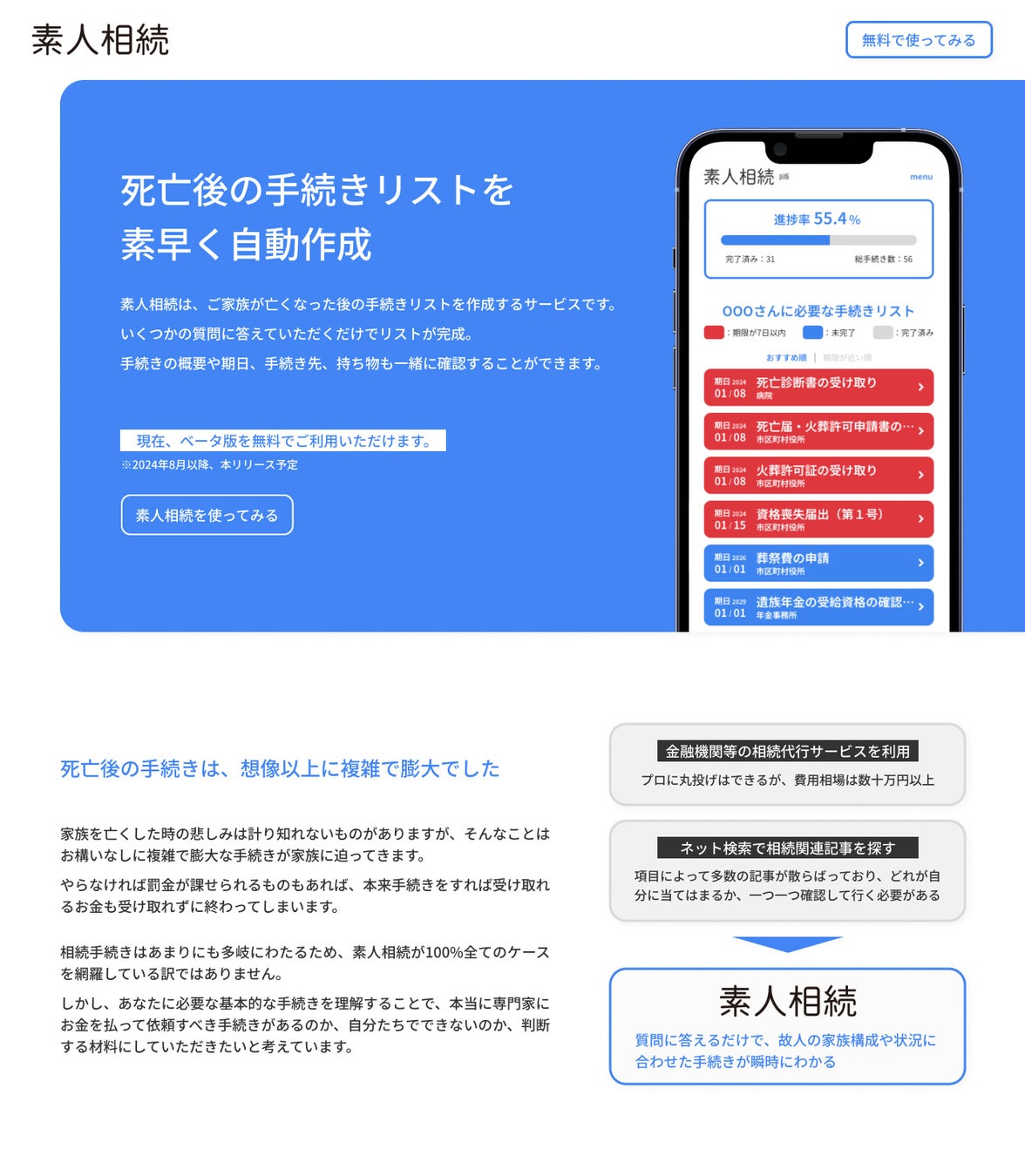 合同会社Webtra(本社:東京都渋谷区/社長:蟹江道弘)は、2024年6月1日から、Webアプリでは初めて(※1)となる、ご親族の死亡・相続に伴い発生する行政手続・民間手続のリストを自動作成できる新サービス「素人相続」β版を無料でリリースしています。
