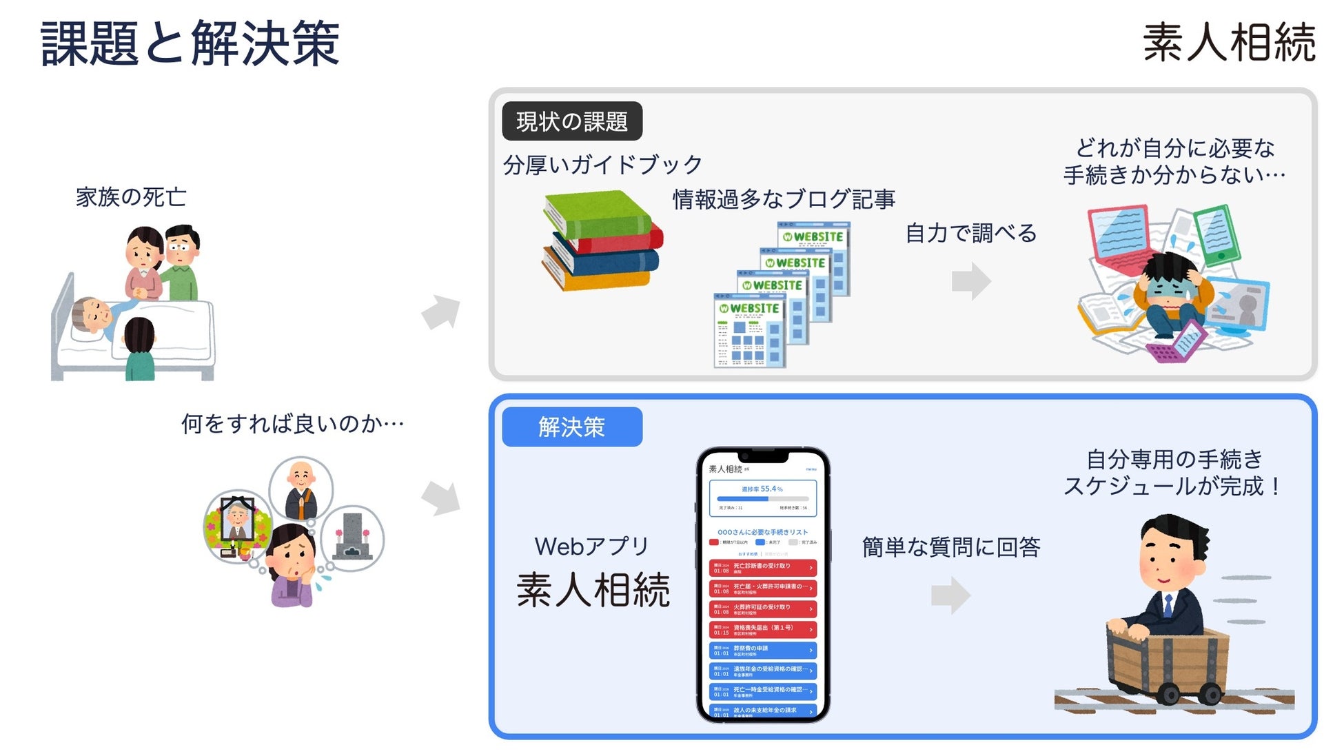 『素人相続』は、"多死社会"における社会問題を解決する新しいソリューションとして、死亡・相続分野のDXを推進し、ご遺族の精神的な負担と金銭的な負担の軽減を実現します。