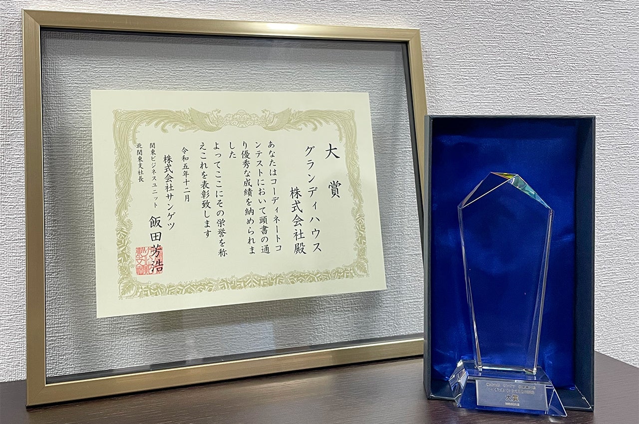 この度当社は「株式会社サンゲツ」北関東支社主催のコーディネートコンテスト2023において、合計320点の応募作品の中からサンゲツ北関東支社全従業員による投票を経て、内装材が素敵にコーディネートされたお部屋として最上位の大賞に選出頂きました。