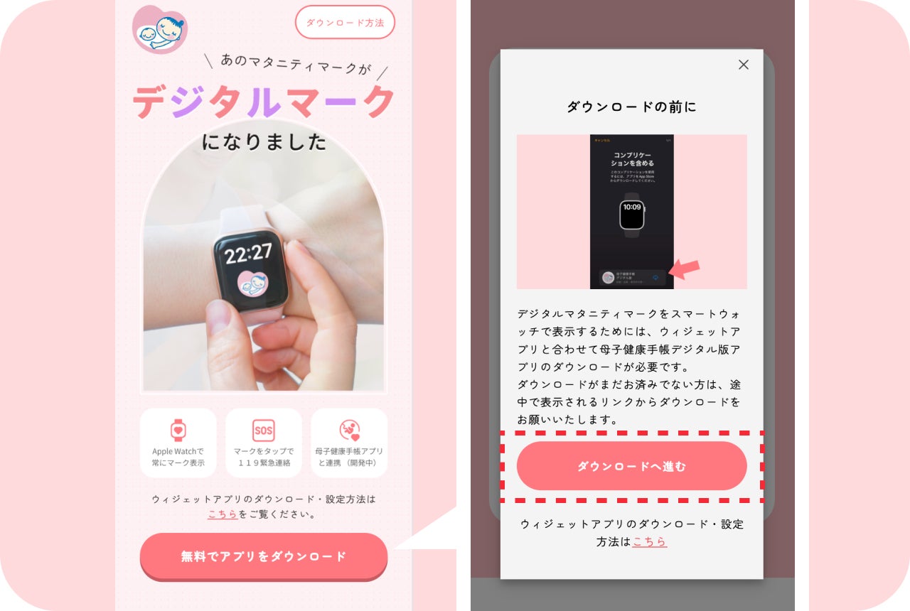 デジタルマタニティマークはApple Watchを連携しているiPhoneで以下のURLまたはページ内二次元バーコードから設定することでどなたでもご利用頂けます。