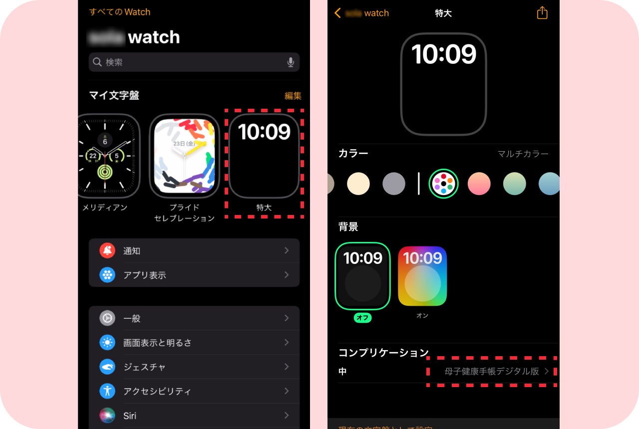 6. ウォッチ選択画面で特大の文字盤を選択してコンプリケーションに「母子健康手帳デジタル版」を設定