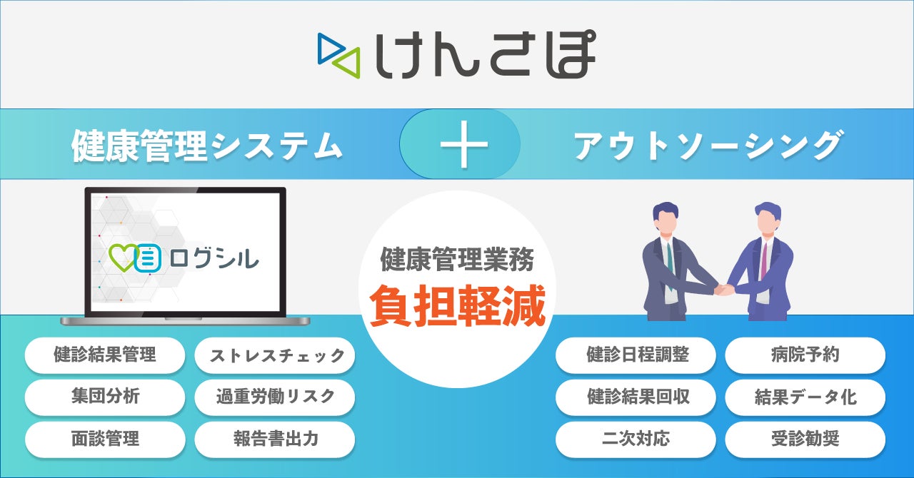「けんさぽ」は健康管理システム「ログシル」とアナログ作業のアウトソーシングを、業界最安値水準である月額100円/人~で提供することで、企業の健康管理業務の負担を大幅に軽減する企業向け健康管理サービスです。