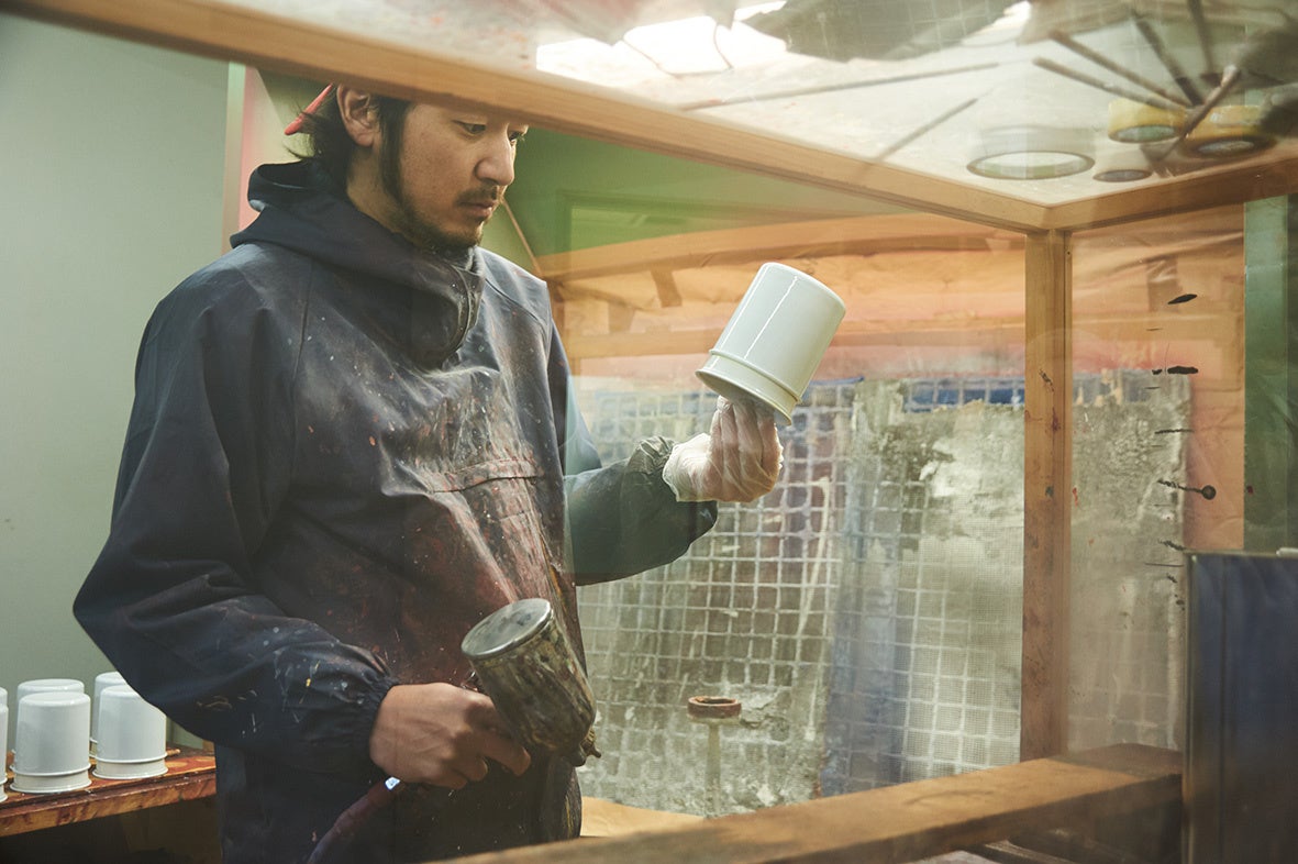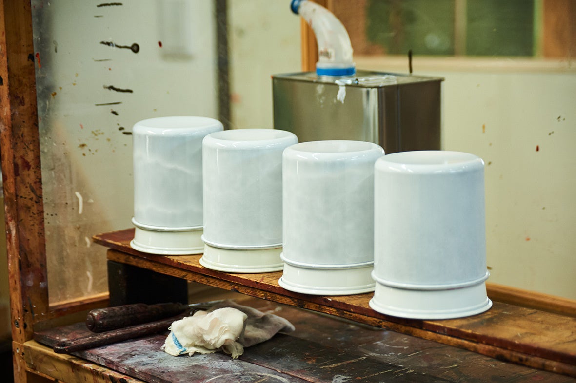 「まるで陶器。」を、キャッチコピーに、樹脂製品に機械では味わえない塗装の垂れや色ムラを取り入れ、陶器のようで陶器よりも扱いやすい製品作りを行なっています。