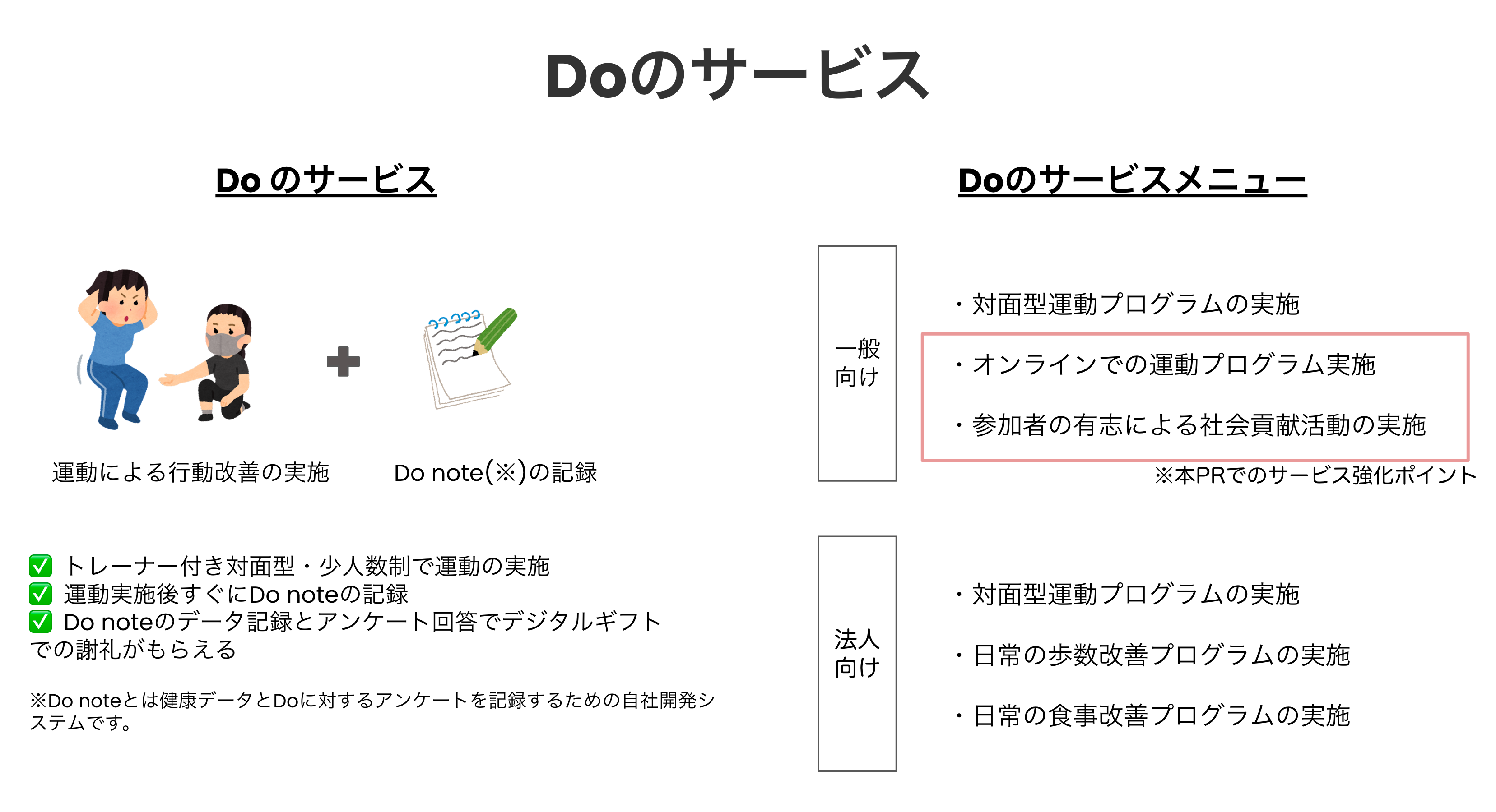 当社が掲げる「すべての人に健康管理と社会貢献の意識の定着を」をVisionとし、2023年3月から有償版の一般・法人向けの両方を対象とした健康DXサービス「Do」を展開してきました。Doのサービス内にて、参加者様ご自身での健康データ記録と振り返りを定常的に行い、振り返りの中で見つかった課題をトレーナーとの対面による運動実施(オンラインも一部含む)、更にはAIによる行動アドバイスにより健康改善の定着を行ってきました。