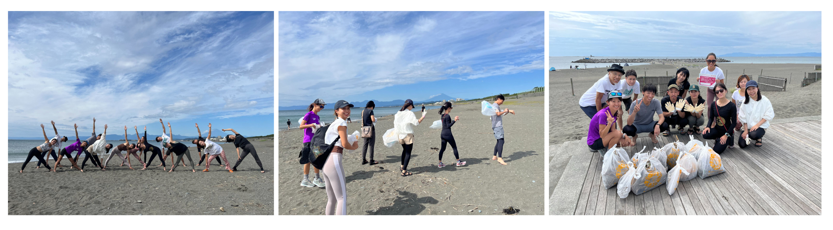 当社としては社会貢献の活動を上述のデジタルギフトからの募金活動に限定するものでは無いと考え、新しい取り組みとして、チャリティープログラムとしてビーチヨガレッスンを開催しました。レッスンへ参加者様・インストラクター・運営スタッフの全員で開催会場となった神奈川県茅ヶ崎ビーチを対象とした、清掃活動を実施しました。※チャリティーでのビーチヨガプログラムについては、事前に茅ヶ崎市役所様から許可を得て実施しました。またビーチの清掃活動については、かながわ海岸美化財団様のご協力を頂いて実施いたしました。