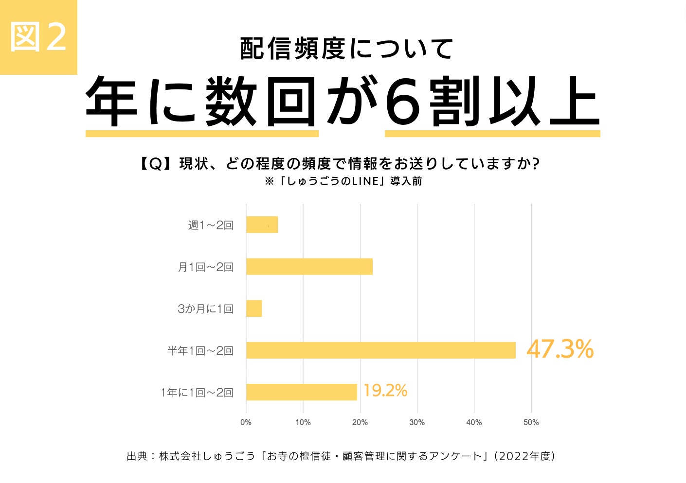「しゅうごうのLINE」サービス導入寺社は、基本的に週1(月間4〜5回)の頻度にて発信を行っており、現状よりも発信頻度を増やすことができます(参考:図2)。また、しゅうごうサポートチームが運用代行にも入ります。(配信コンテンツの作成・配信・分析レポート)。「時間がない」「告知をうっかり忘れてしまう」「操作方法に不安がある」…という方にも安心です。
