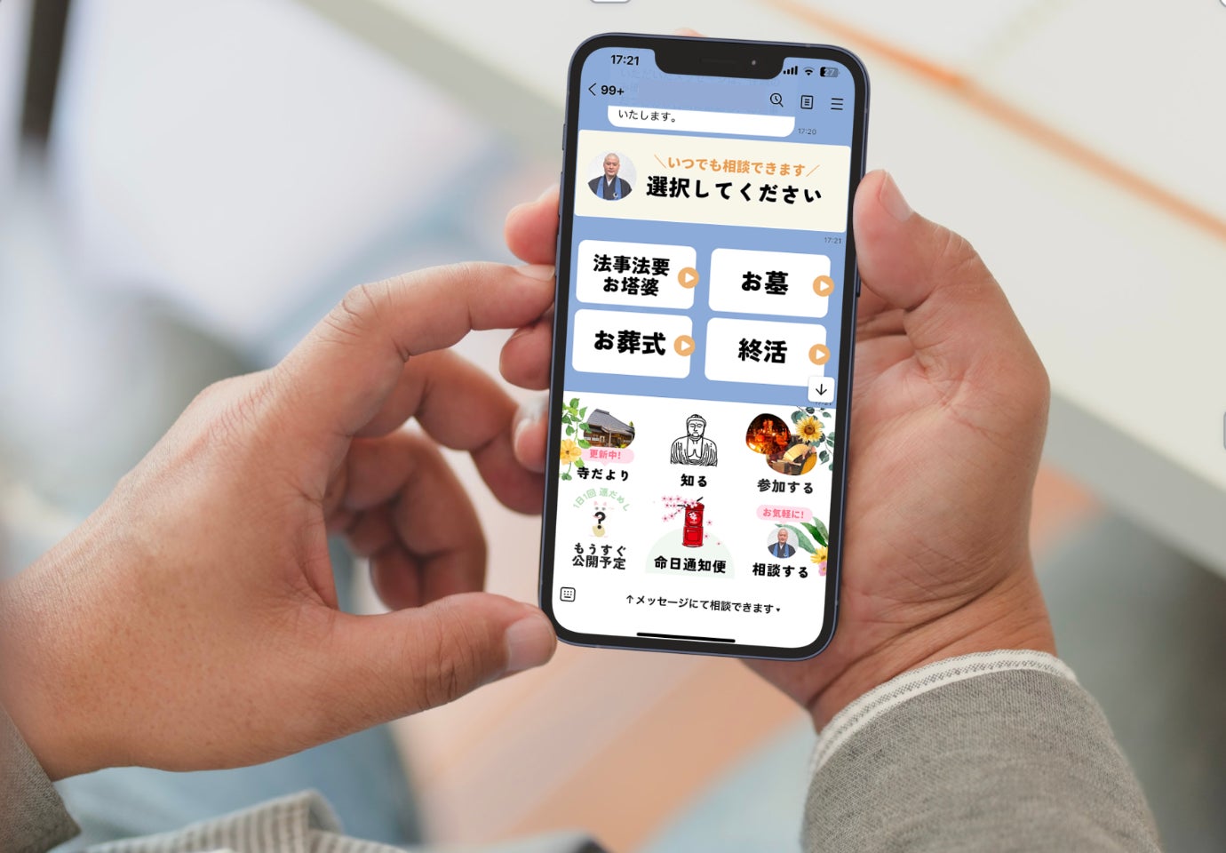 法事法要、葬儀、お墓‥など、LINE内で相談ごとを承ることができます。チャットボットを作成することも可能です。ご相談カテゴリーに応じて、適切な情報・問合せ先を表示します。