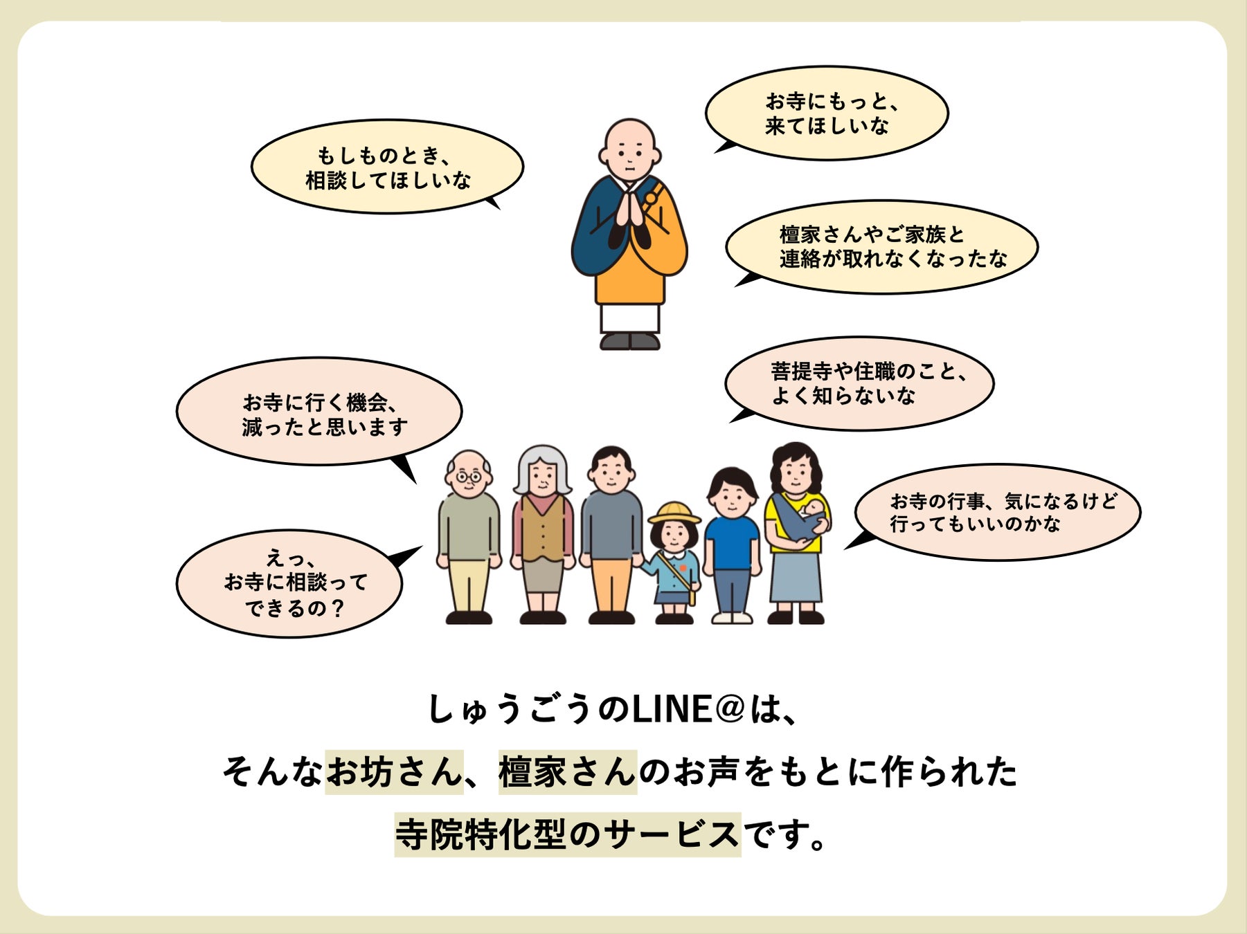 しゅうごうのLINEは、お坊さん・檀信徒さん双方のお声をもとに作られた、寺社特化型LINEアプリです。導入後、寺社行事への参加者が増えたり、法事法要やお墓、お葬儀に関するご相談が受けやすくなるなど、目に見える成果を感じる寺社が増えています。
