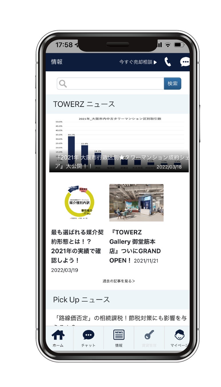 「TOWERZ CHECK」は、大阪市内のタワーマンションを対象として、その「現在の資産価値(売却査定額)」をワンクリックで表示させる機能を搭載したスマホ専用の資産管理アプリです。