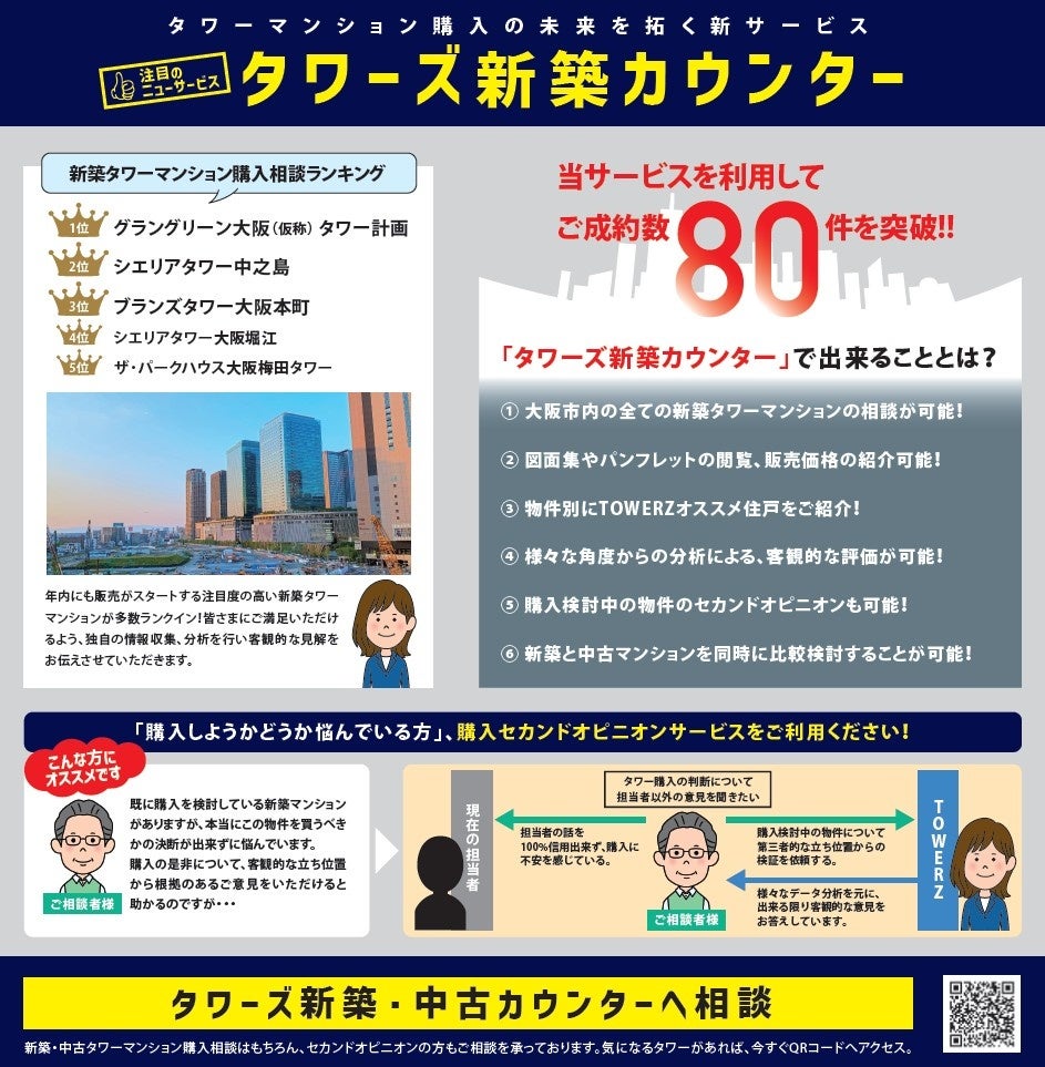 タワーマンションの売買・賃貸などを専門とする当社においても、未竣工物件の査定額算出は非常に難易度が高く、中々明確なご回答が出来ないこともあったため、大阪の新築タワーマンションを専門にデータ分析を行う分析機関「タワーマンション研究所 TOWERZ Lab.」全面協力のもと、今回の新機能の開発に取り組むことを決定しました。