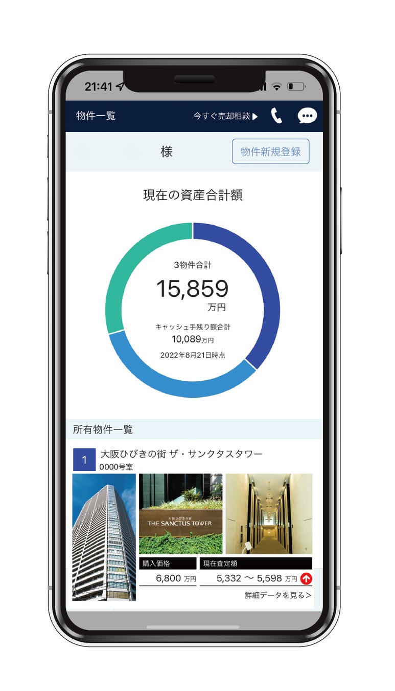 所有するタワーマンションの資産価値を瞬時に査定することができ、自身の不動産資産価値のすべてをリアルタイムにチェックできる「資産管理アプリ」です。