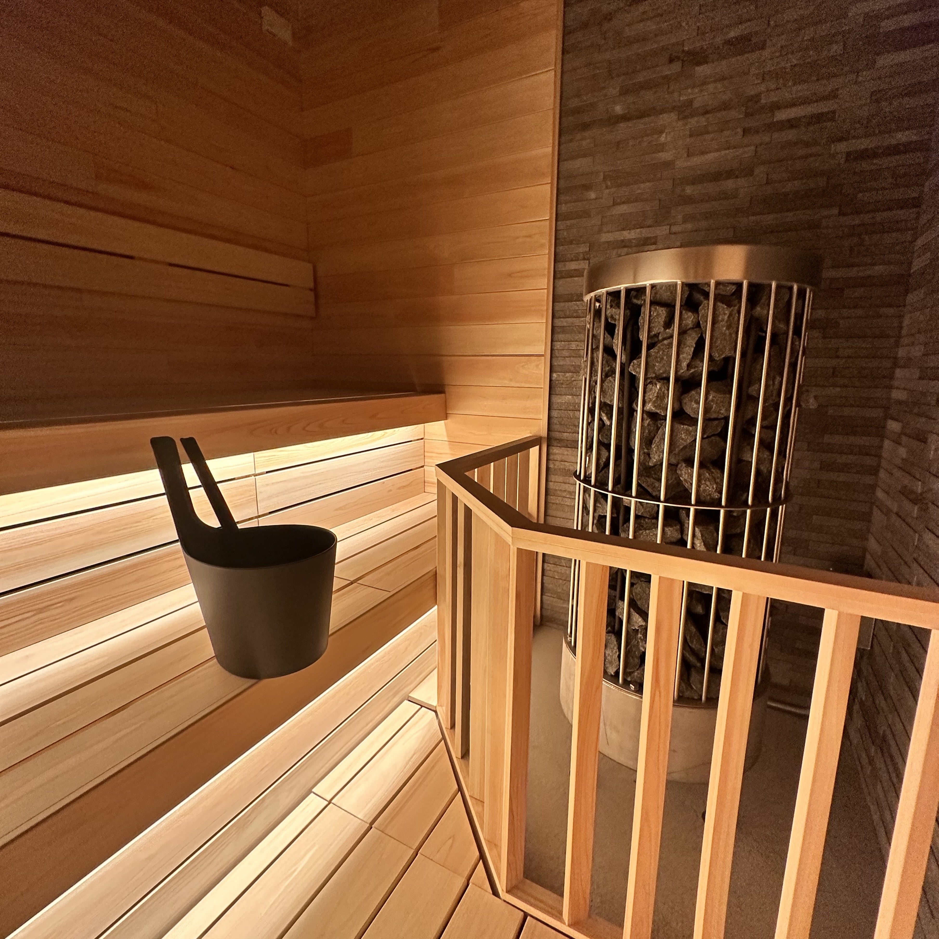 (セルフロウリュ用の桶と柄杓。好きなタイミングでロウリュを楽しめる。)