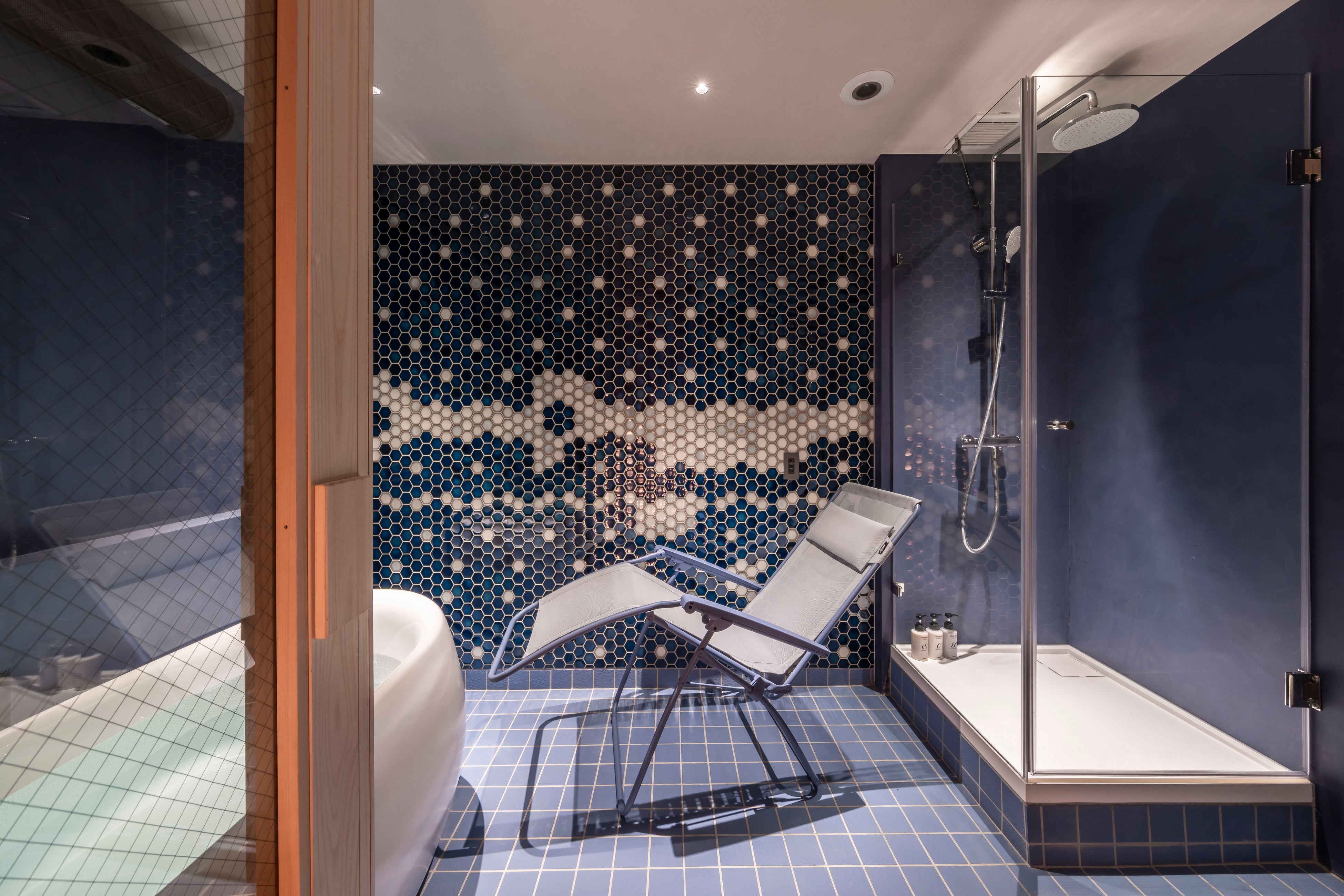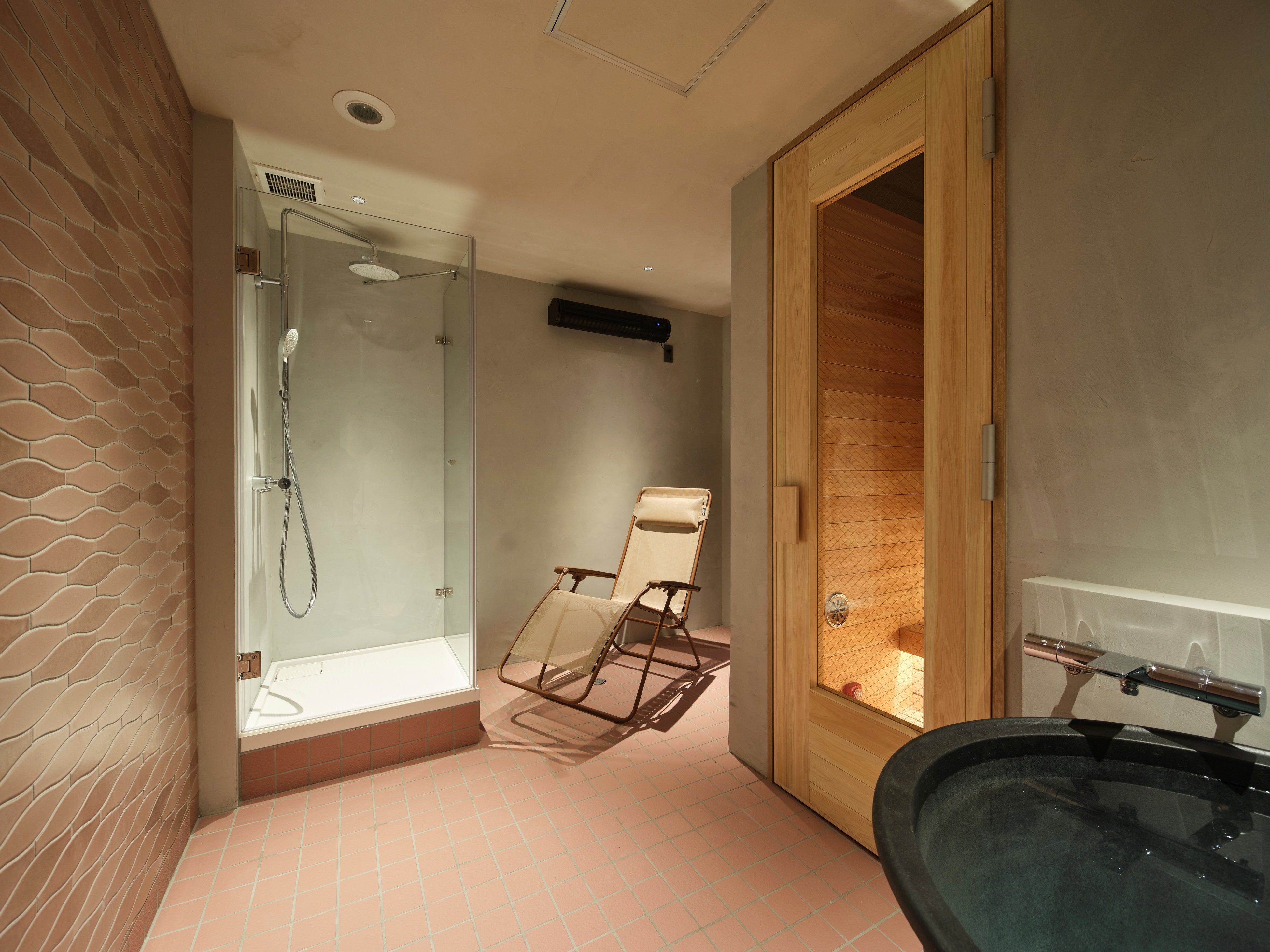 サウナで体を温めた後にくつろいでいただく「ととのいルーム」は、6部屋全ての壁や床のタイルの色を変えています。水風呂もお部屋によって浴槽のタイプが異なるので、お部屋ごとに雰囲気の違いを楽しんでいただけます。(ととのいルームの一例。上:【neljä(4)】、下:女性専用ルーム【Viisi(5)】。)今後、冷水チラーの設備を導入予定でキンキンに冷えた水風呂に浸かることができるようになります。ととのいイスはサウナ業界の最新トレンドにもなっているフランス製の「Lafuma」を全部屋に導入しております。空調にはダイキン製のサーキュレーターを導入しており、お客様ご自身で風量・風向・温度をコントロールが可能です。外気のような自然な風を発生させる特徴があり、まるで外気浴をしているような快適な「ととのい時間」をお過ごしいただけます。そのほかにも、携帯端末などの充電ができるようにコンセントを完備しており、Bluetoothスピーカーも無料で貸し出ししているのでお好きな音楽や動画をお楽しみいただけます。