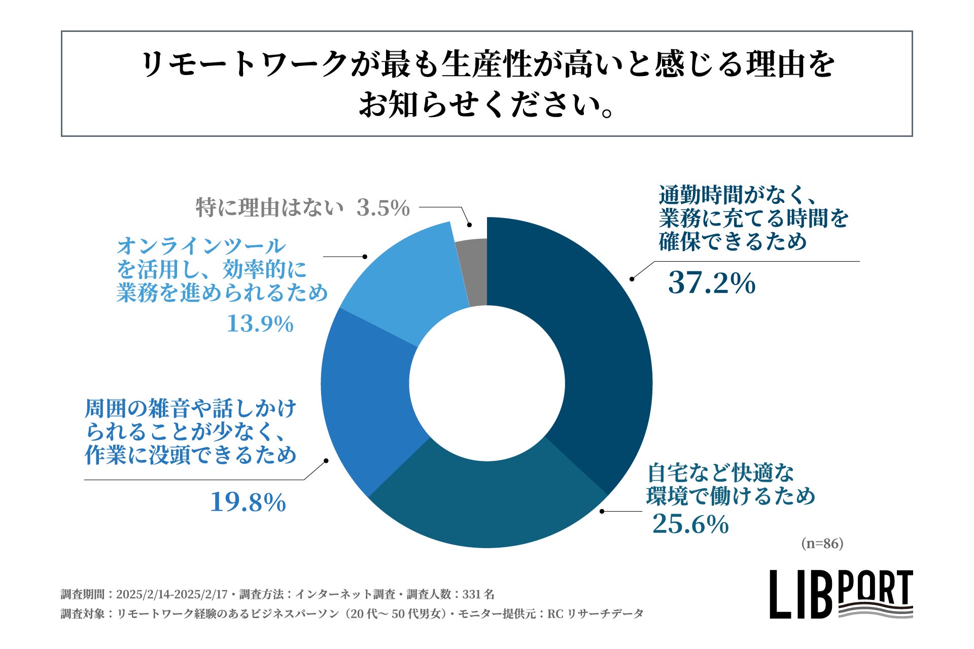 また、最も生産性が高いと感じる勤務環境は「リモートワーク」と回答された方に、「リモートワークが最も生産性が高いと感じる理由」を尋ねる設問への回答では、1位が「通勤時間がなく、業務に充てる時間を確保できるため」で37.2%、2位が「自宅など快適な環境で働けるため」で25.6%、3位が「周囲の雑音や話しかけられることが少なく、作業に没頭できるため」で19.8%という結果になりました。この結果から、リモートワークが最も生産性が高いと感じる人の多くは「リモートワークは通勤時間がなく、業務に充てる時間が確保できること」が生産性を高めると考えていることがわかりました。