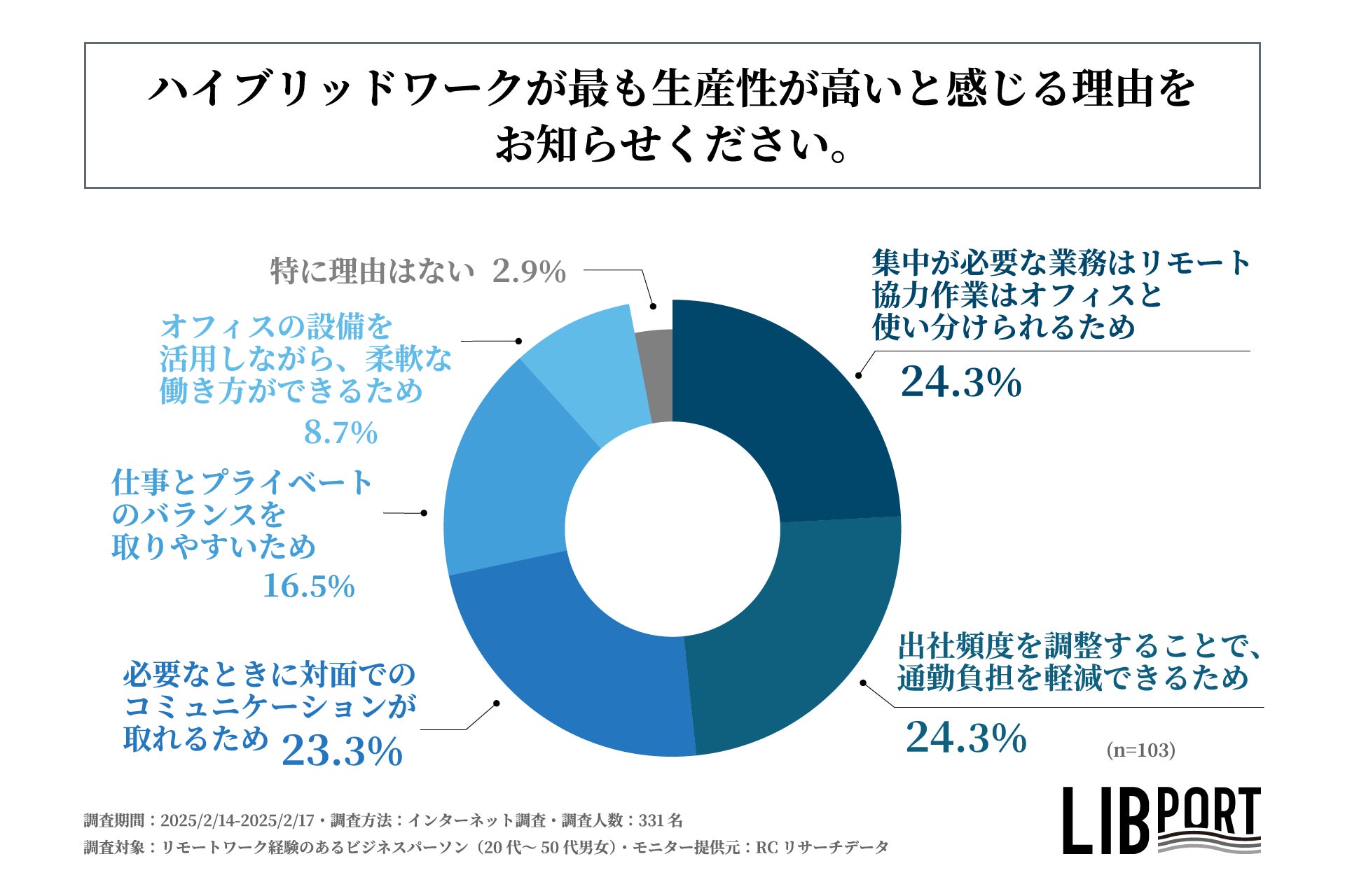 次に、最も生産性が高いと感じる勤務環境は「ハイブリッドワーク」と回答された方に「ハイブリッドワークが最も生産性が高いと感じる理由」を尋ねる設問への回答では、1位が同率で「集中が必要な業務はリモート、協力作業はオフィスと使い分けられるため」と「出社頻度を調整することで、通勤負担を軽減できるため」で24.3%、3位が「必要なときに対面でのコミュニケーションが取れるため」で23.3%という結果になりました。この結果からハイブリッドワークが最も生産性が高いと感じる人の多くは、ハイブリッドワークは「オフィス勤務とリモートワークの双方の良いところを活かせること」が生産性を高めると考えていることがわかりました。