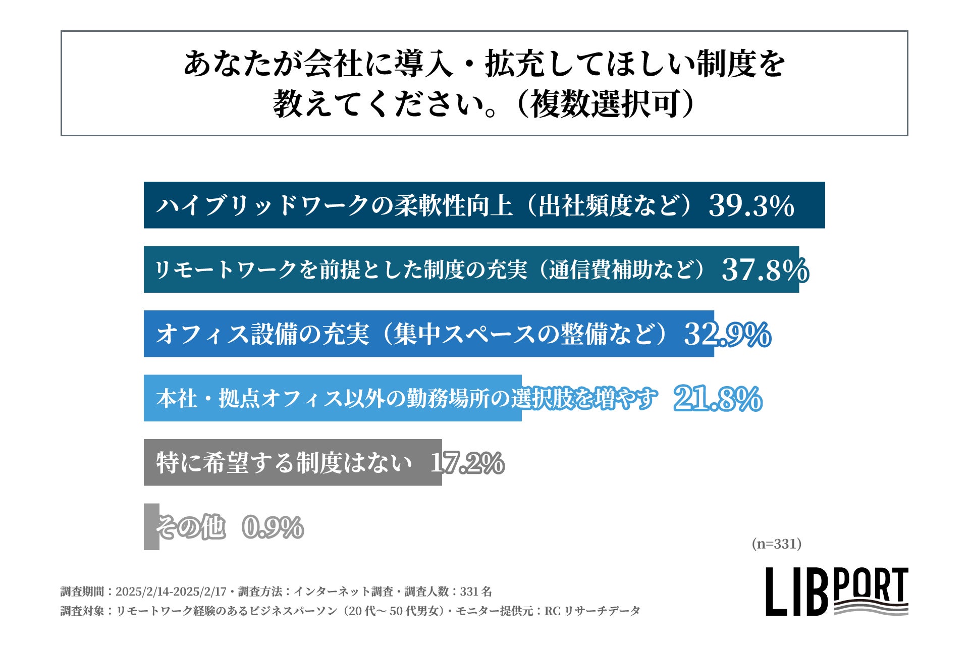 リモートワークを経験したビジネスパーソンが、会社に導入・拡充してほしい制度トップ3は、1位「ハイブリッドワークの柔軟性向上」、2位「リモートワークを前提とした制度の充実」、3位「オフィス設備の充実」