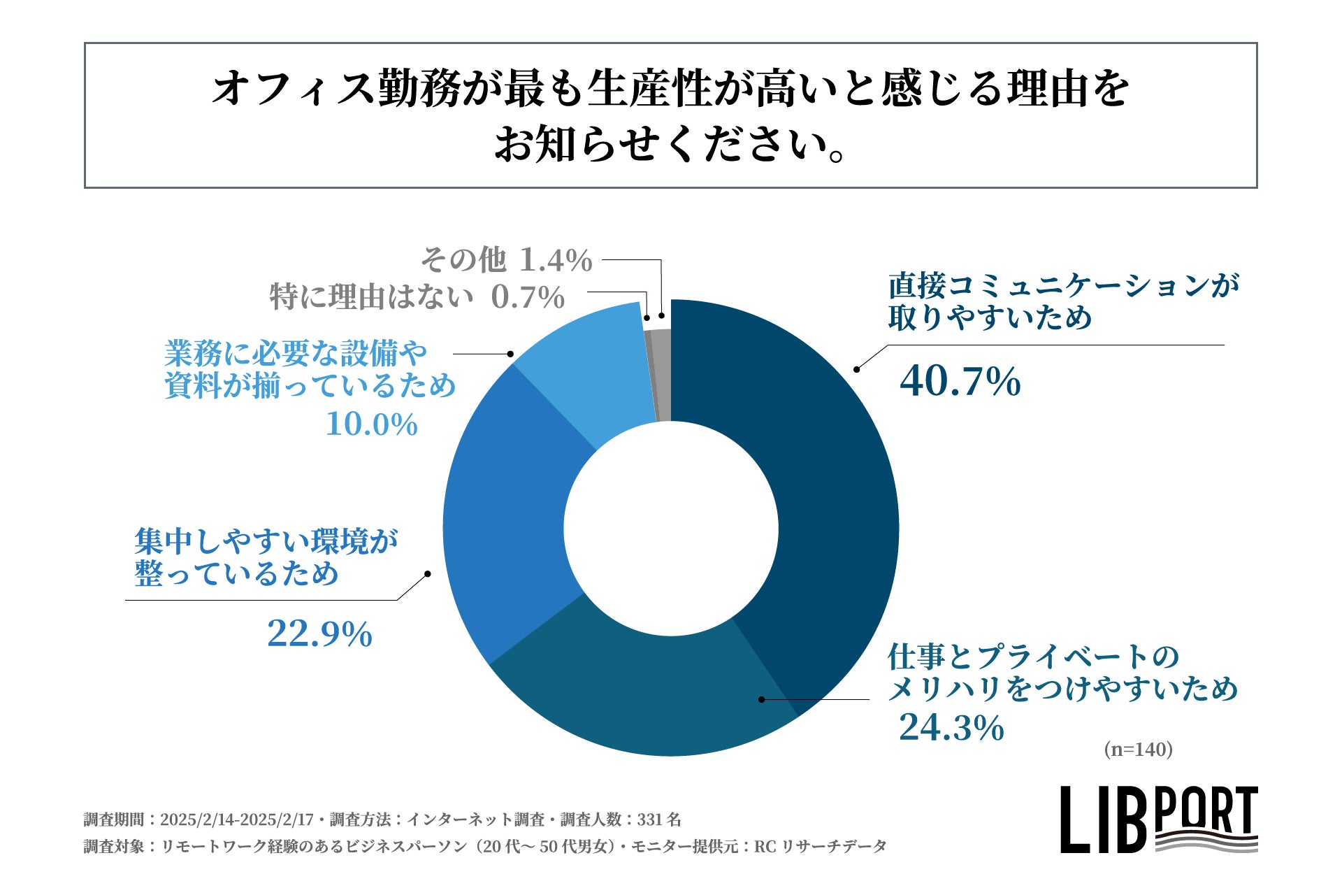 続いて、最も生産性が高いと感じる勤務環境は「オフィス勤務」と回答された方に「オフィス勤務が最も生産性が高いと感じる理由」を尋ねる設問への回答では、1位が「直接コミュニケーションが取りやすいため」で40.7%、2位が「仕事とプライベートのメリハリをつけやすいため」で24.3%、3位が「集中しやすい環境が整っているため」で22.9%という結果になりました。この結果から、オフィス勤務が最も生産性が高いと感じる人の多くは「一緒に仕事をする人と直接コミュニケーションが取りやすいこと」が生産性を高めると考えていることがわかりました。