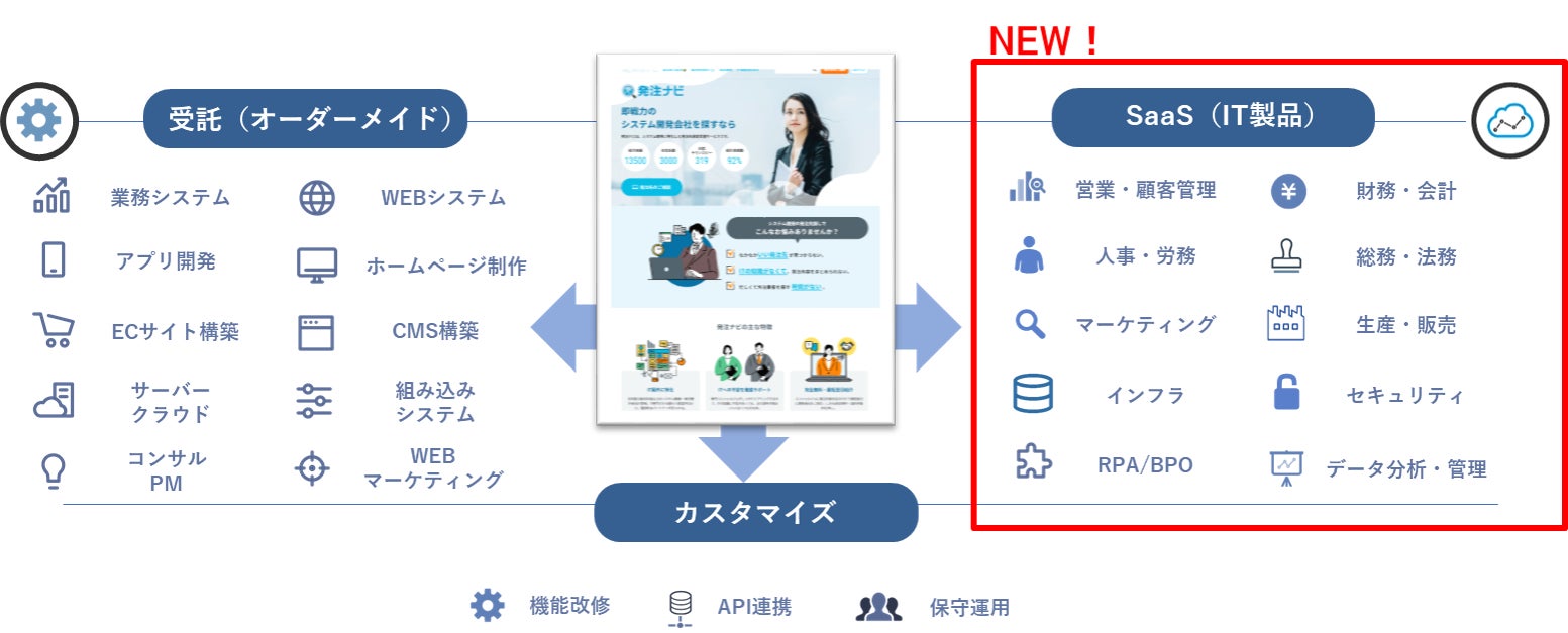 この度、システム開発会社向けに培ったノウハウを展開し、新たにSaaSベンダー/SaaS製品のデータベースを構築することで、SaaSベンダー向けのマッチングサービスを提供開始します。これにより発注ナビは、カスタムでのシステム開発に限らず、既成のSaaS製品もカバーすることになり、相談元企業のDX成功をより多面的に支援することが可能になります。