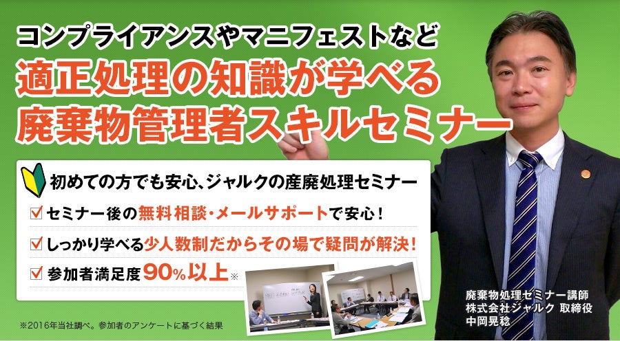 大阪堺筋本町に本社を構える株式会社ジャルクは、9月21日(木)に恒例となった「廃棄物管理のポイントがわかる!産業廃棄物処理法基礎セミナー」を今回は大阪市内で無料にて開催する。