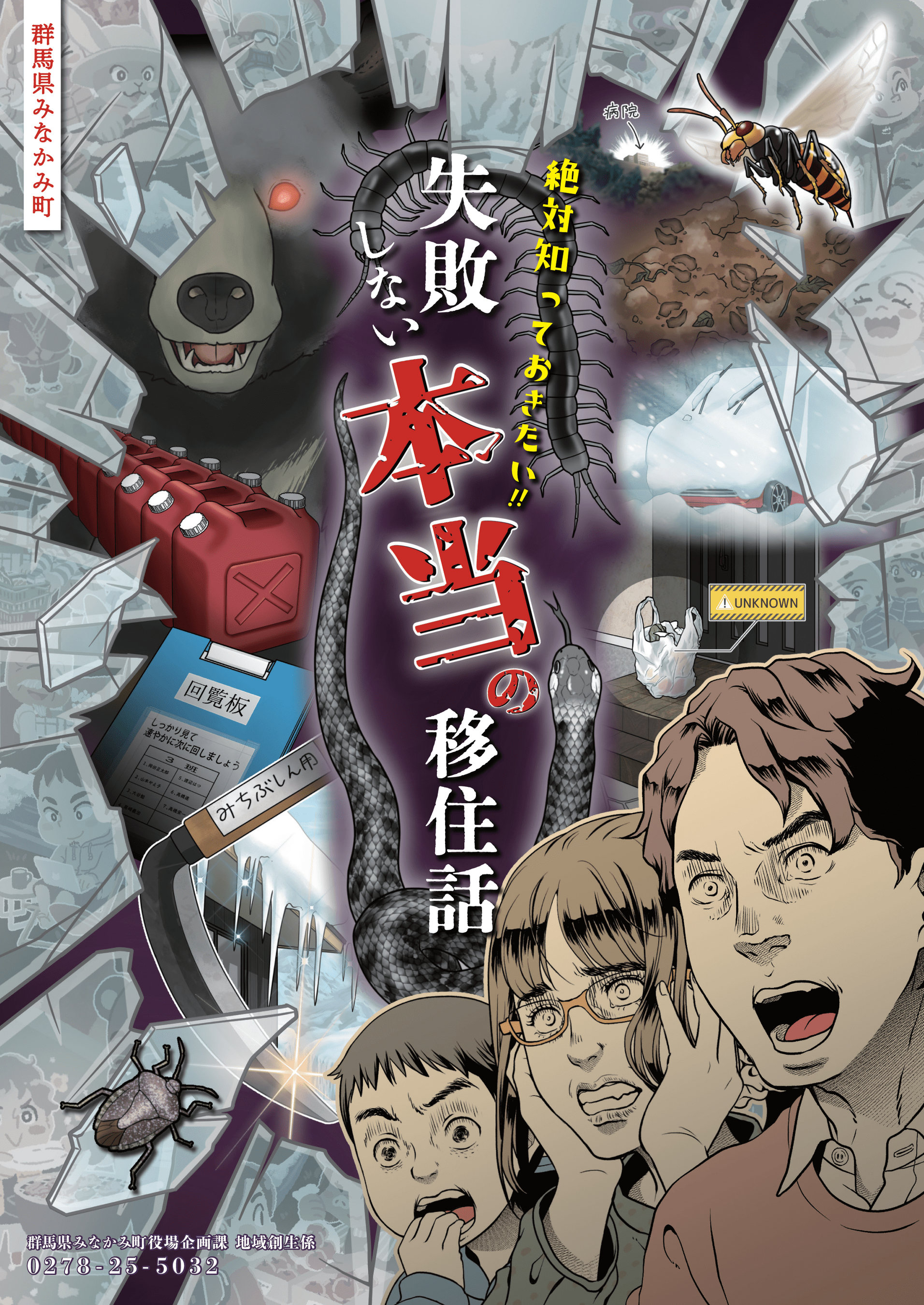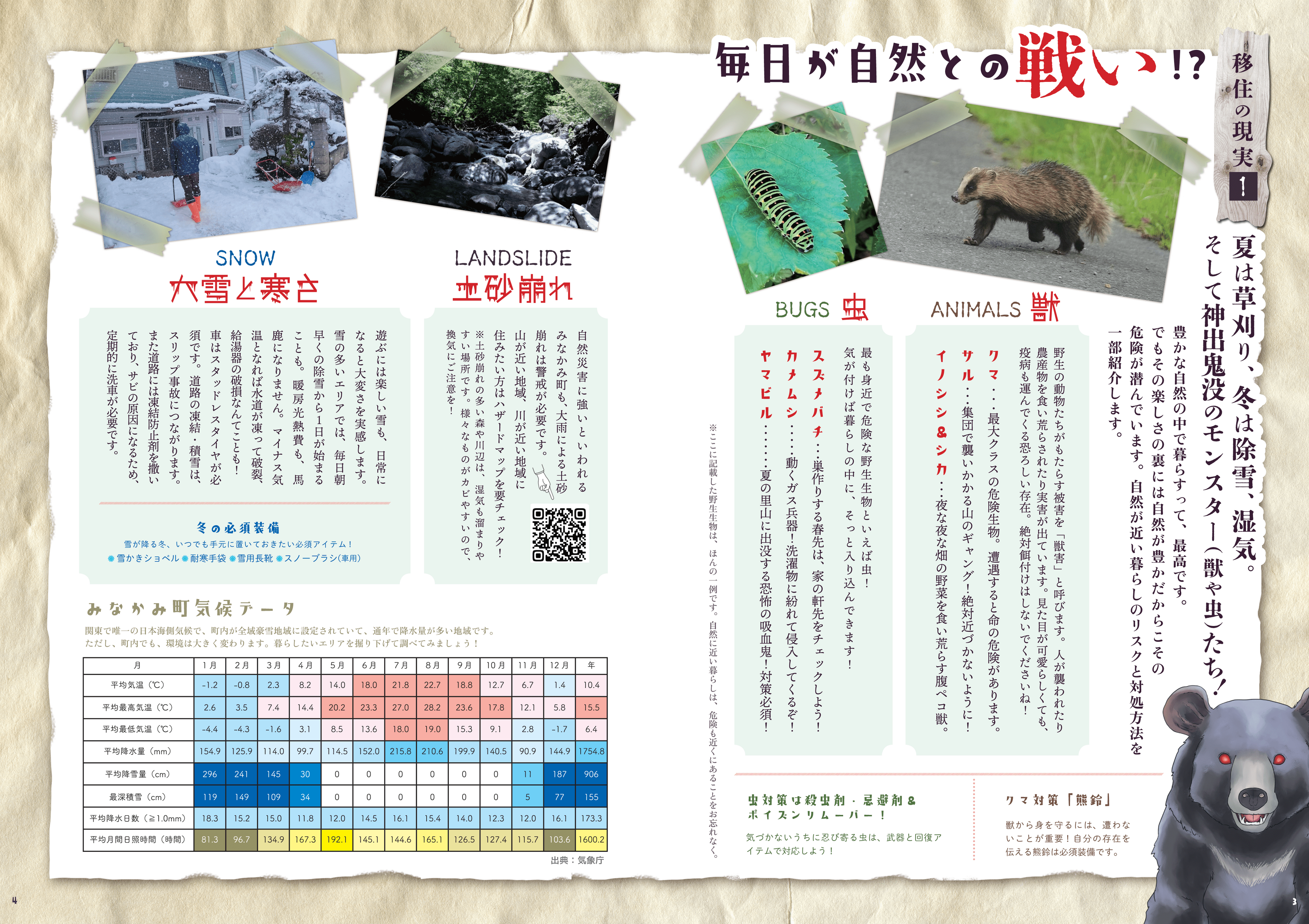 移住パンフレットとしては珍しい両A面冊子仕様で、表面「暮らそうみなかみ町移住ガイドブック」では町の特徴や補助制度、先輩移住者のインタビュー等を紹介。裏面「絶対知っておきたい!!失敗しない本当の移住話」では地域の慣習や自然環境の厳しさなどを紹介しています。