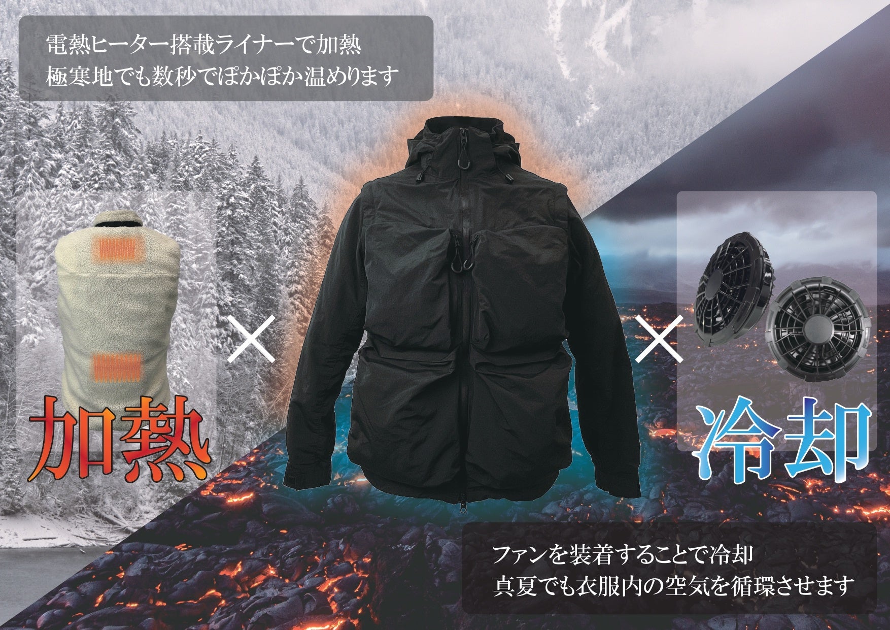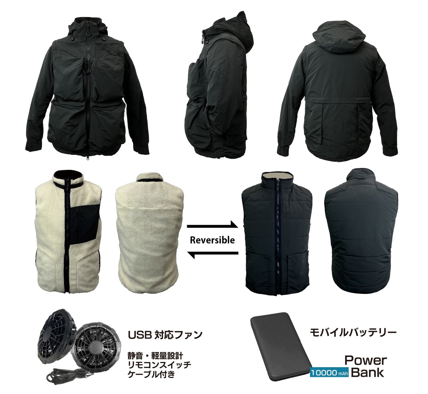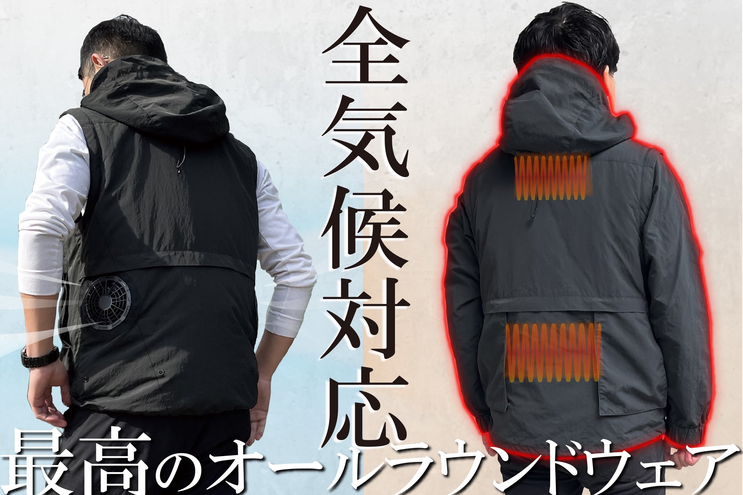 全気候対応×大容量収納!空調ファン&背面ヒーター&モバイルバッテリー&撥水&着脱式パーツ&リバーシブル&ライナー&NASA採用超断熱素材&ポケッタブル搭載!最高のオールラウンドウェアできちゃいました!