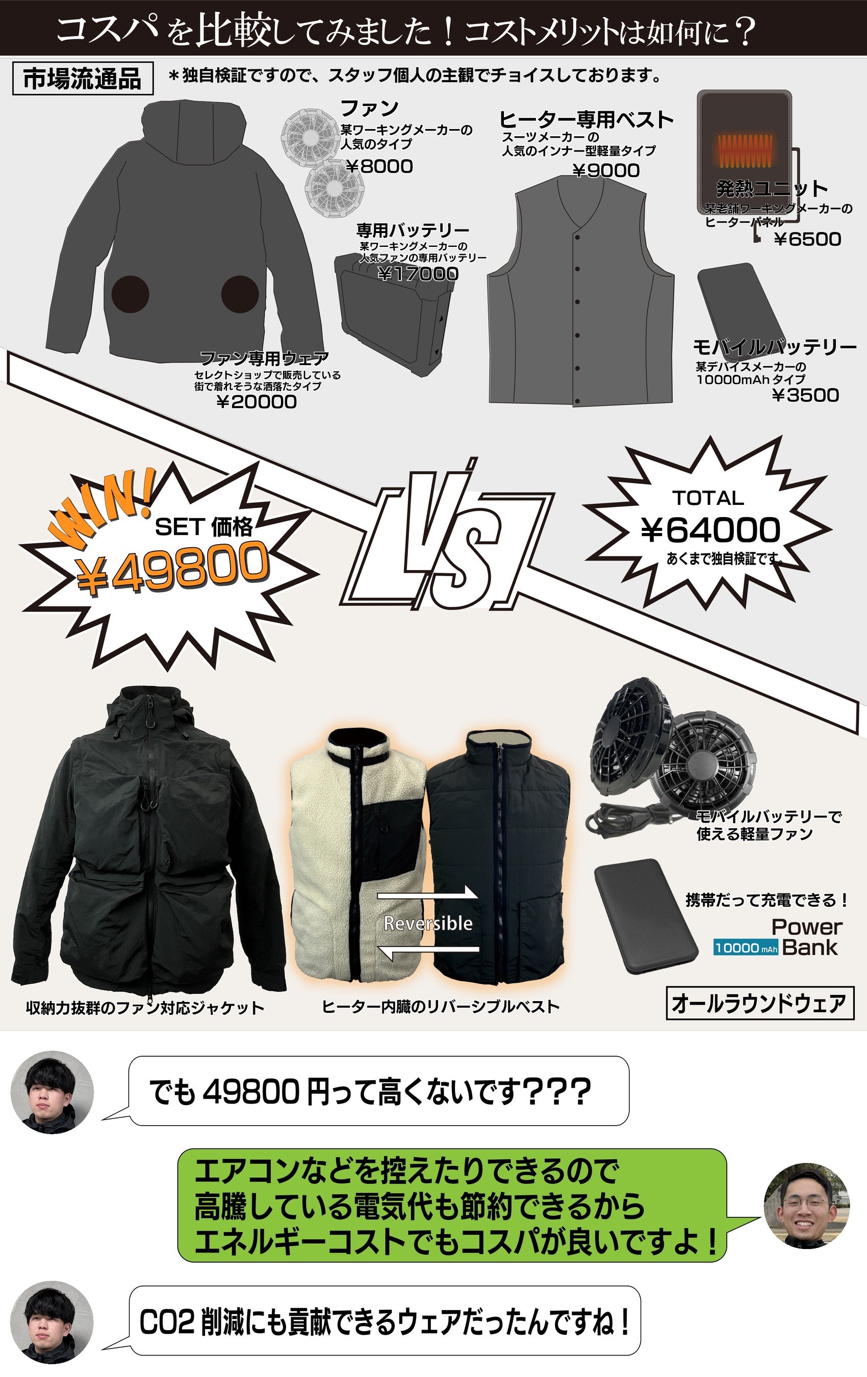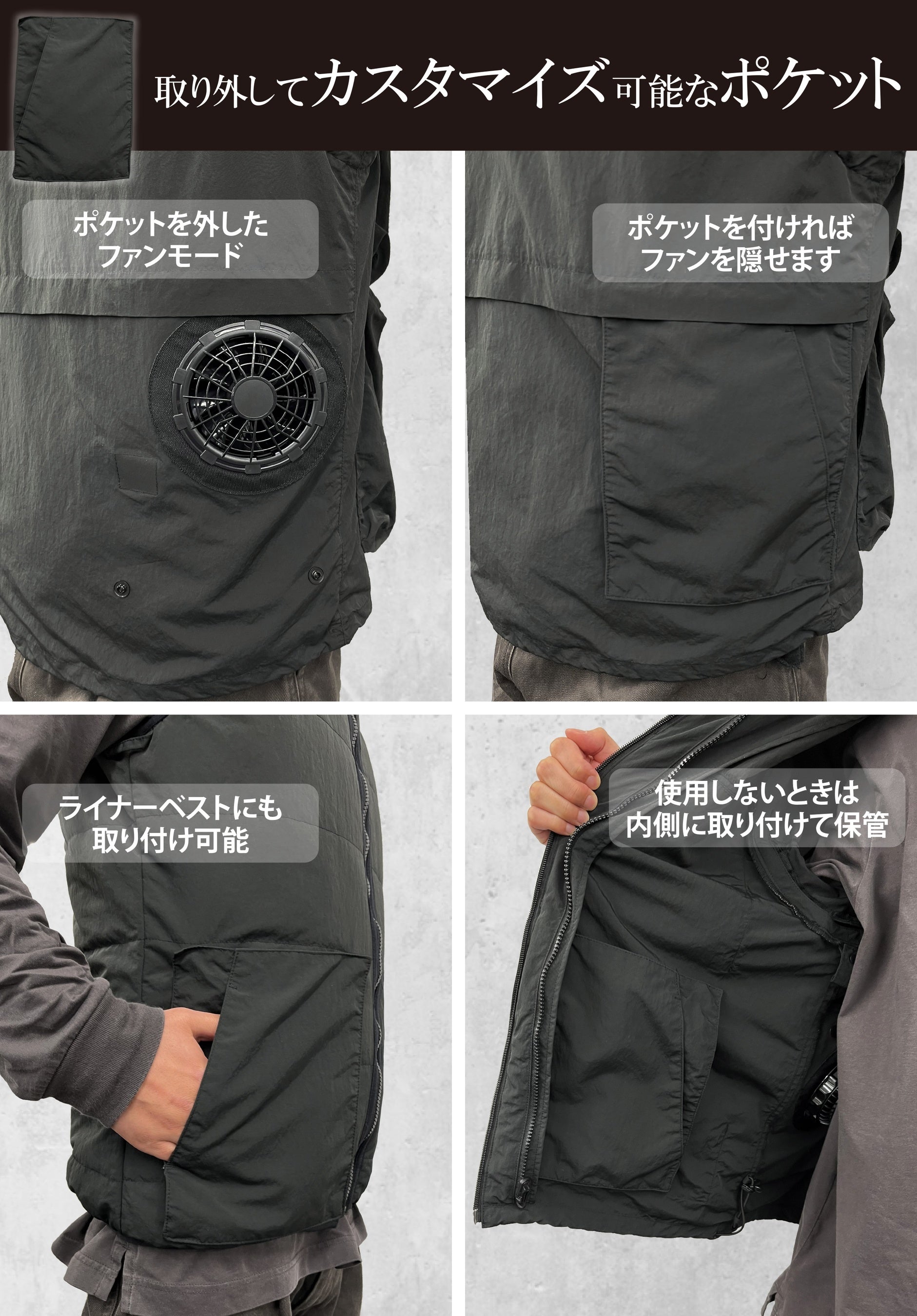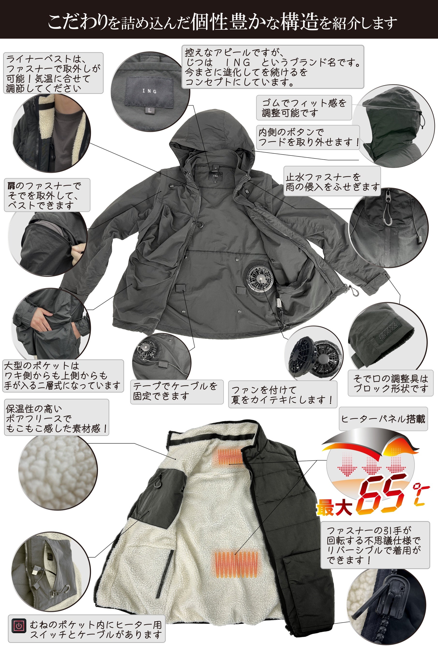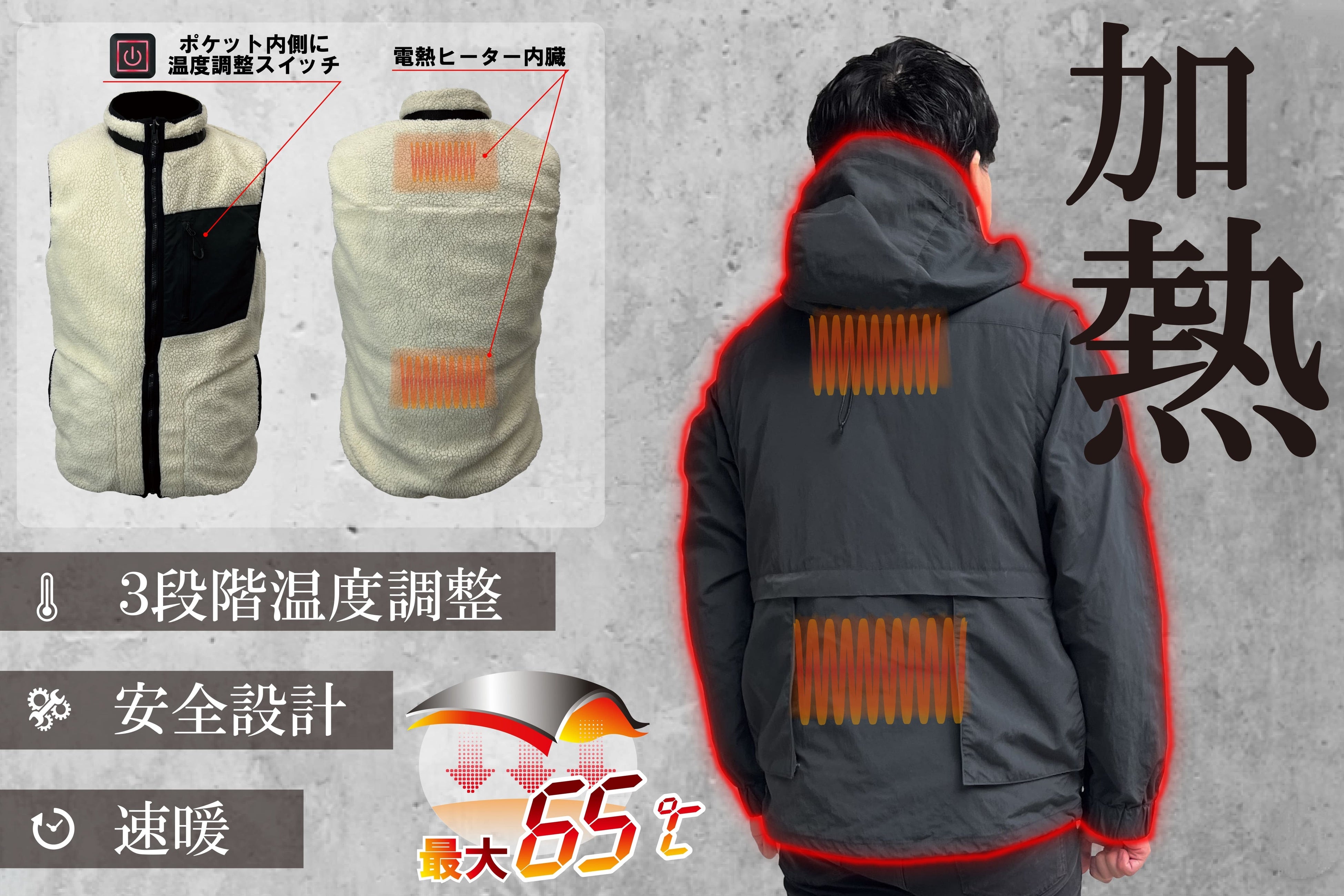 全気候対応×大容量収納!空調ファン&背面ヒーター&モバイルバッテリー&撥水&着脱式パーツ&リバーシブル&ライナー&NASA採用超断熱素材&ポケッタブル搭載!最高のオールラウンドウェアできちゃいました!