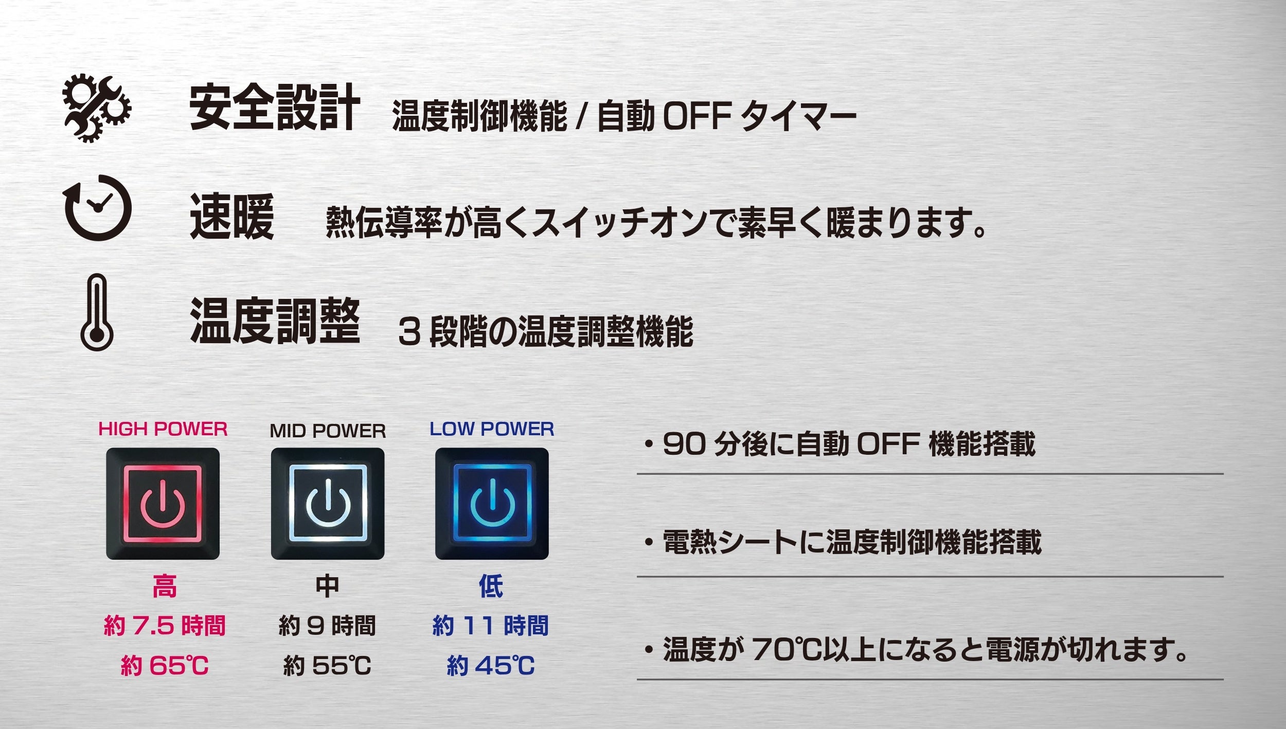 3段階の温度調整、最大65℃の出力、最大温度で約7.5時間稼働!