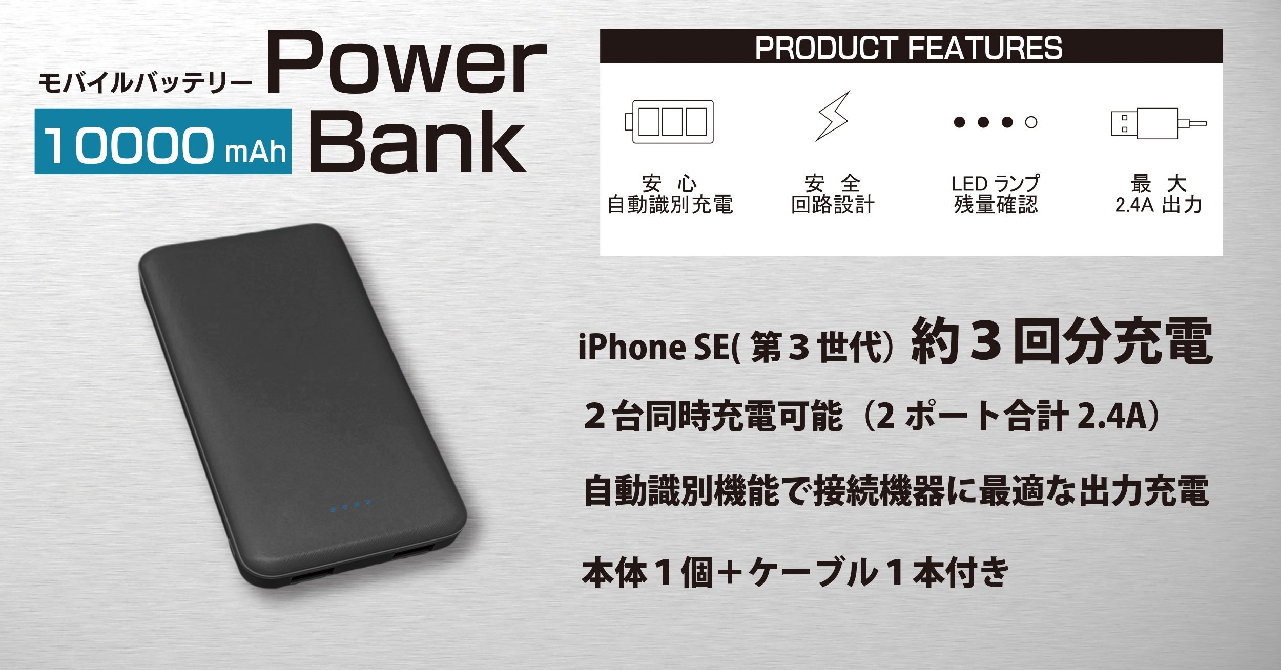 USB Type-A規格/大容量10000mAh/縦長薄型デザイン/自動識別機能/LED残量確認ランプ/安全回路搭載!