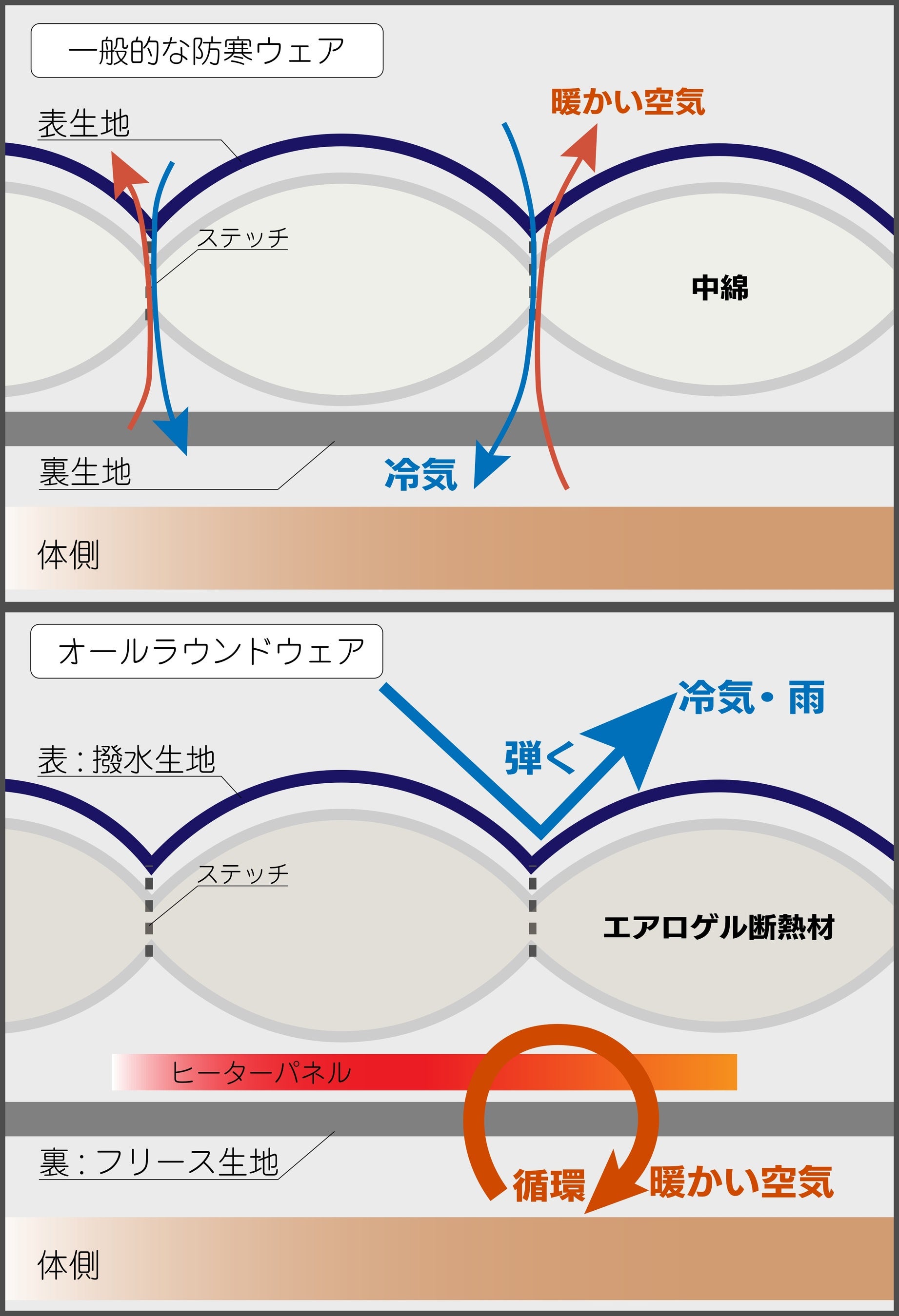 ライフスタイルに合わせて冷暖調節可能な多機能ジャケットを新開発。ジャケットとベストの組み合わせにより体温調節可能な空調ウェア⇔ヒーターウェアに早変わり!普段使いからアクティビティにも対応可能です。