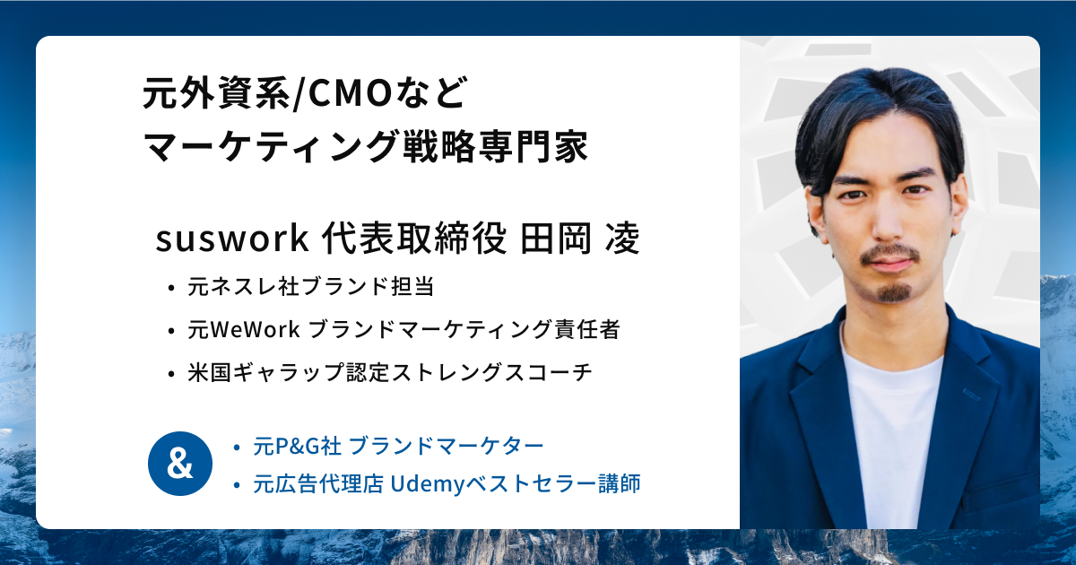 suswork株式会社は、外資系メガブランドで活躍したマーケティングの専門家が多数在籍する戦略グロースファームです。マーケティング戦略の立案・実装を通じて、スタートアップや大企業の事業のさらなる可能性を拓き、飛躍的な事業成長に貢献します。