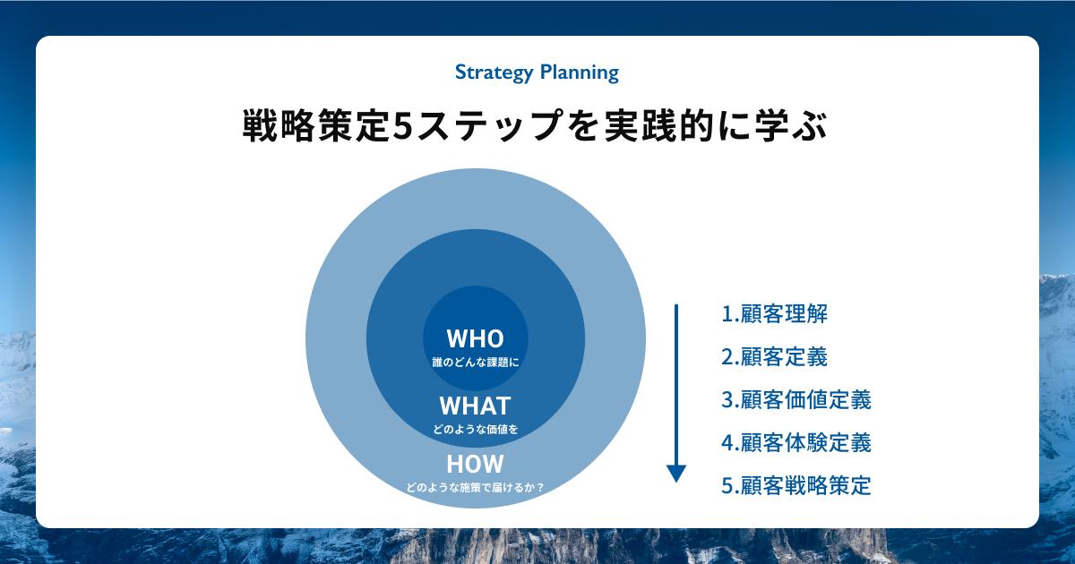 講義では、マーケティング戦略「WHO/WHAT/HOW」について、実際にマーケティング専門家陣が数十社のマーケティング戦略策定支援で活用している「Marketing 5OS」を通じて体系的に学びます。