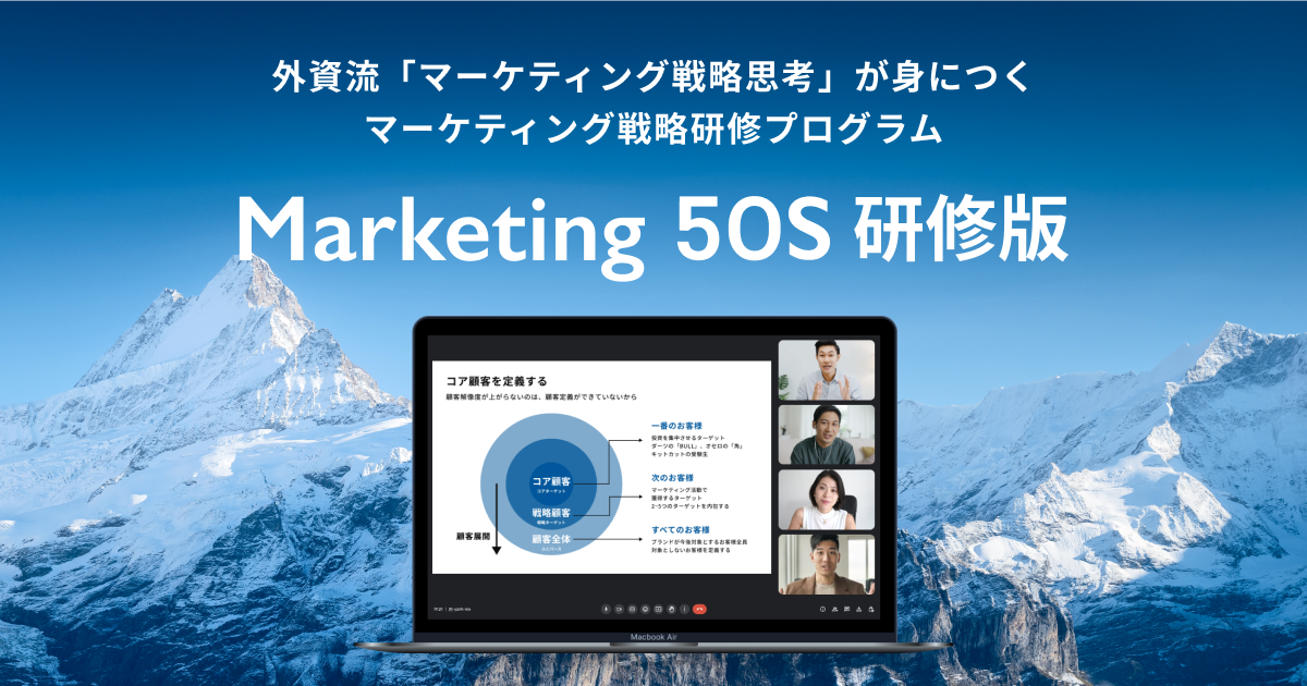 「Marketing 5OS研修版」では、元ネスレ・P&Gなど外資メガブランドで活躍したマーケティング専門家陣と共に、グループ講義・実践ケーススタディー・個別フィードバックを通じて、実務でそのまま活きる「マーケティング戦略思考」の実践的体得を目指します。