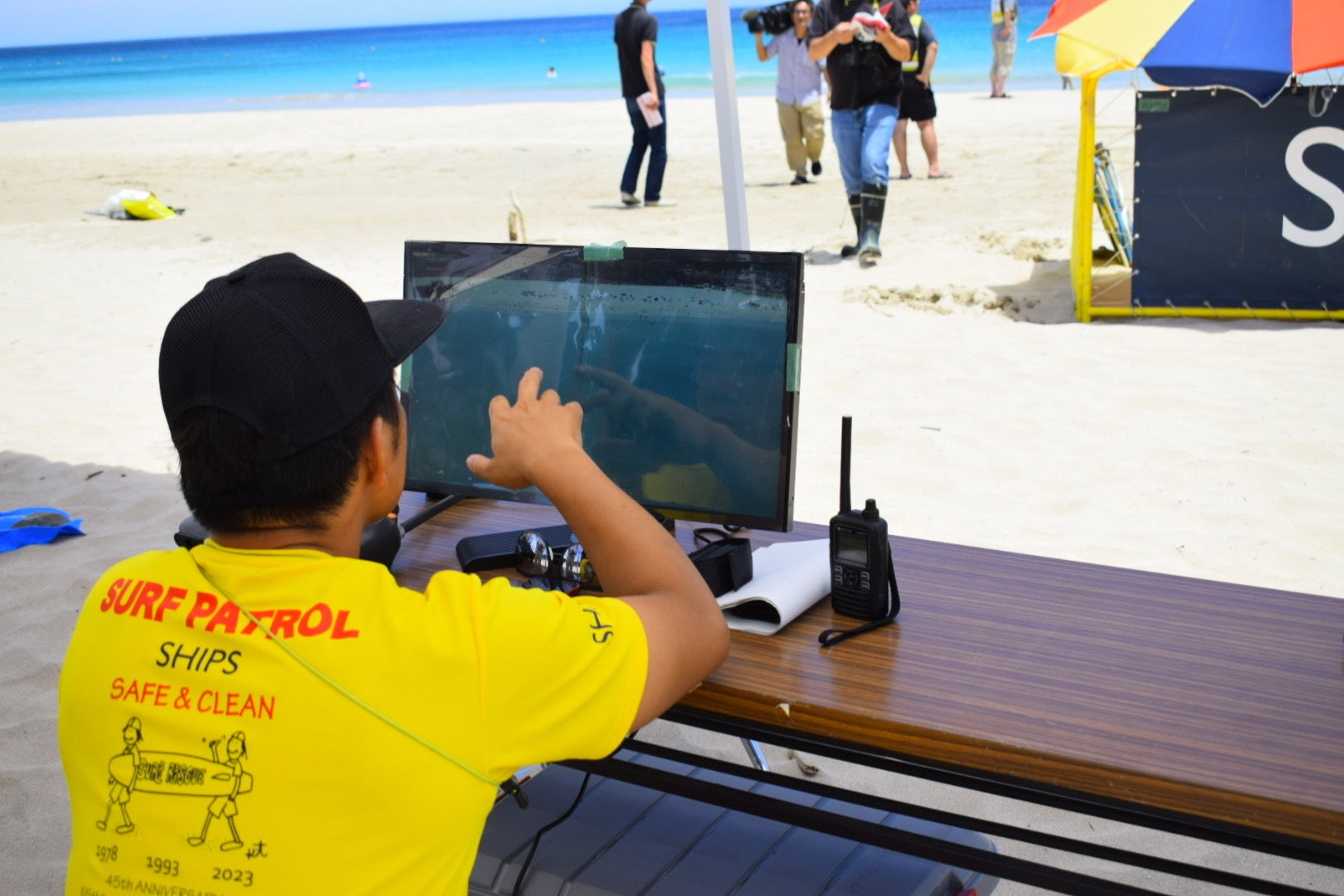 水上バイクへの注意喚起、立入禁止区域へのアナウンス等を行い、音声、映像ともに明瞭で良好な結果が得られました。先進技術を利用することで、ライフセービング人材の多様化や、より安全で安心できる海づくりに取り組んでいきます。