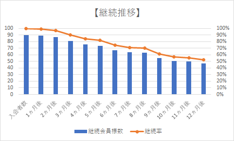 2022年1月以降に入会された会員様の継続推移を見ると、「3ヶ月後の継続率は90%」「半年後の継続率は74%」と推移しており、1年後の継続率は52%となっております。