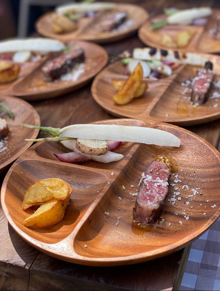 料理は本場フランスの3つ星レストランで修業後、国内5つ星ホテルの総料理長を歴任し、またハンターでもある飯島豪シェフ監修のフレンチスタイルの本格的BBQ料理。地産地消をテーマに厳選された旬な地元食材を使用しメインは鹿肉のジビエ料理となります。